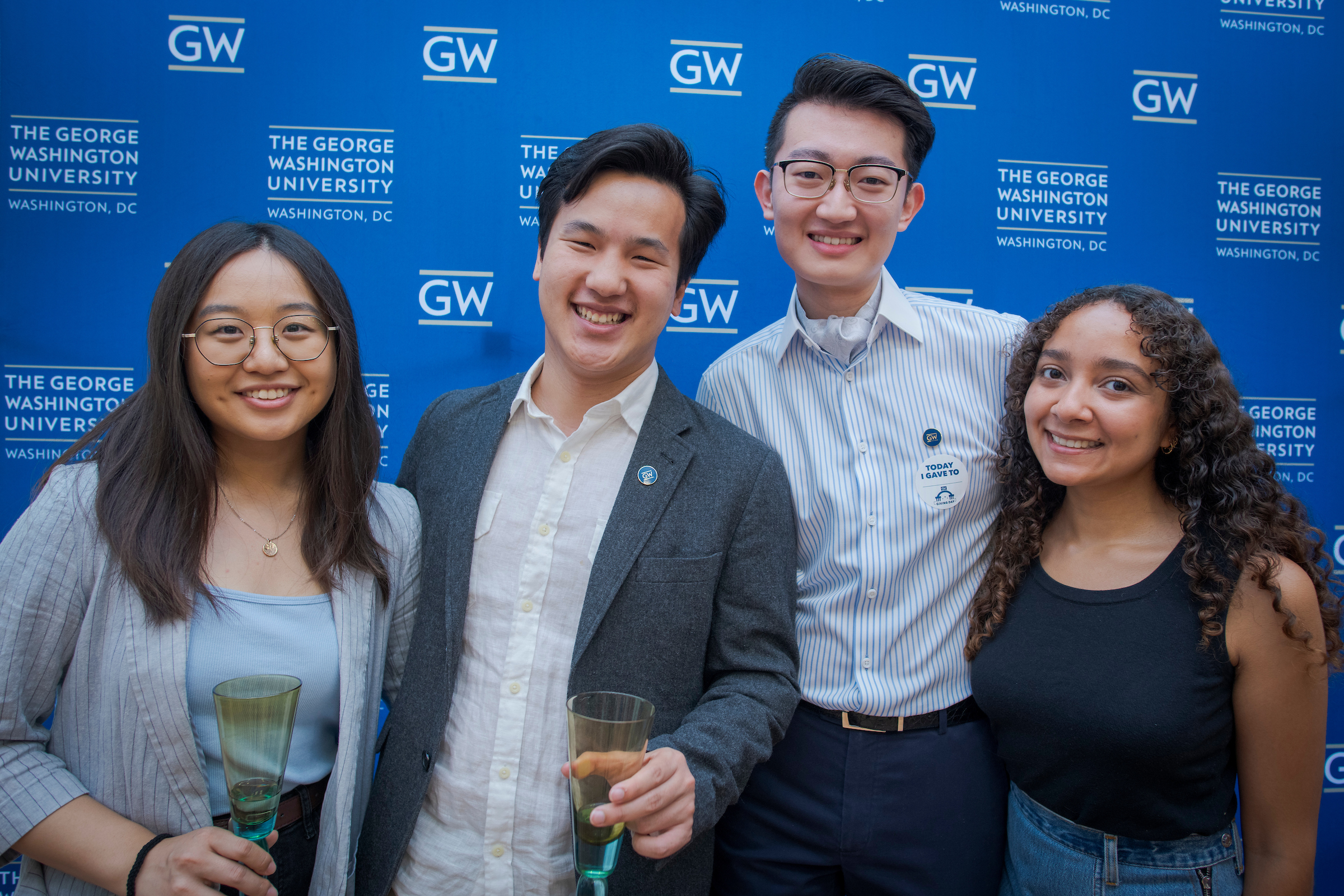 Finally, GW Alumni Association (GWAA) President Max Gocala-Nguyen welcomed graduates as the newest members of the GWAA and helped shepherd them into position for the traditional group photo, glasses lifted.