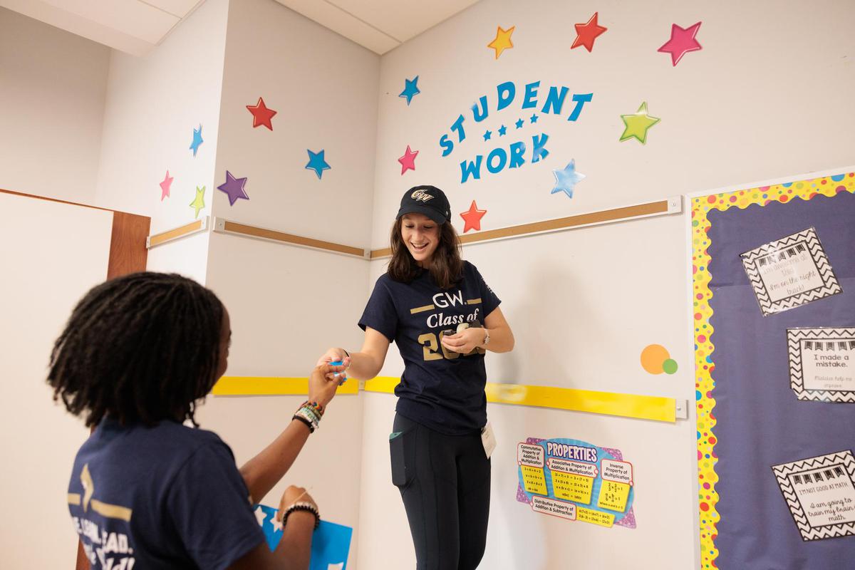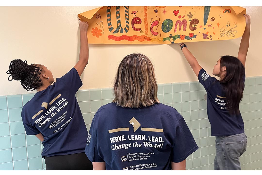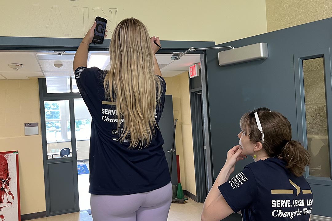 At Malcolm X Elementary School, in readiness for classes that start Monday, the walls were freshly painted a soothing soft vanilla yellow, the lime green tiles polished to a mirror finish and the floors buffed to reflect the sunlight coming in through the windows. About 40 GW students were making the environs more welcoming for young children, using their creative skills to design colorful murals and posters for halls and bulletin boards.