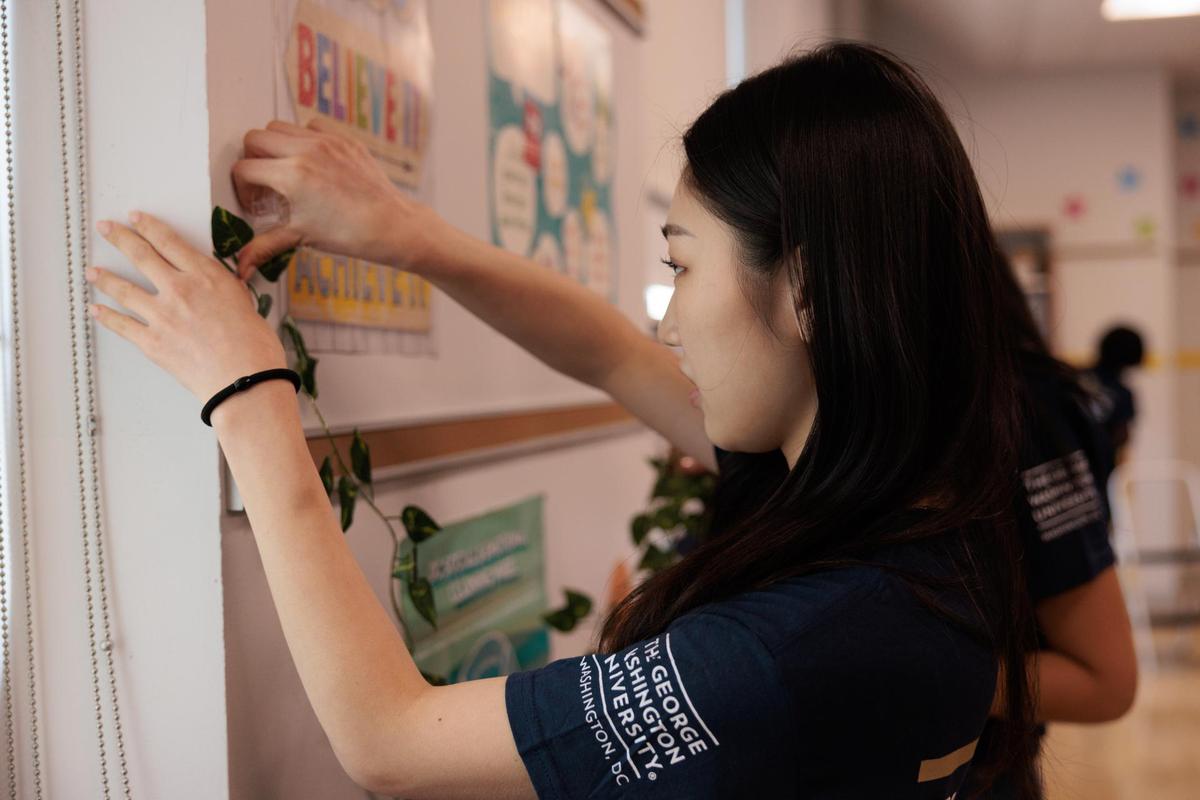 The GW students serving at Mazique split up their efforts among classrooms and spent the afternoon cleaning, organizing toys and books, doing gardening and hanging signs on the walls to brighten up the space for the incoming children.