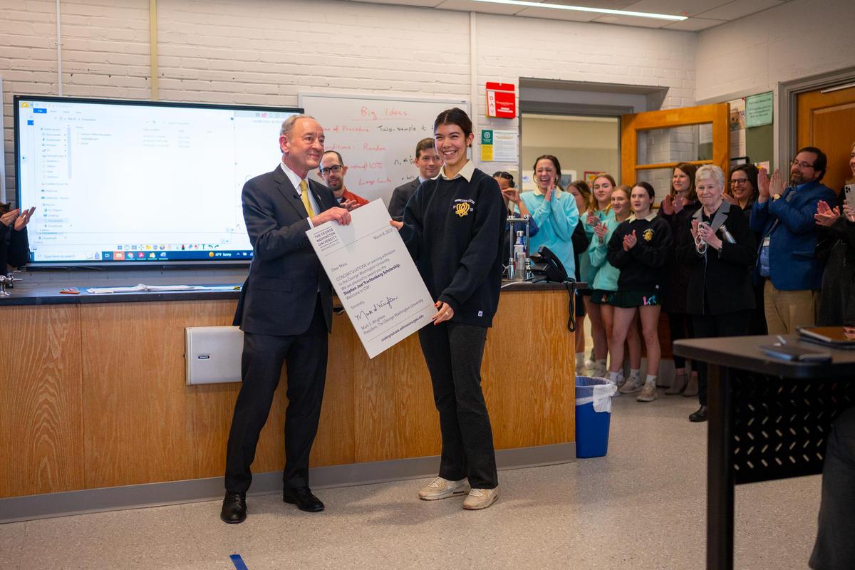 But visitors from the largest university in D.C.—George Washington University—quickly interrupted the in-class activity to deliver to Evans, a highly involved leader and exemplary STEM-focused student at McKinley Tech, some big news. She will have the opportunity to remain a leader in the city and be a part of its solution for her own generation and others behind her as university officials awarded her a Stephen Joel Trachtenberg (SJT) scholarship. Not only had she been admitted to GW, but the scholarship would also cover the full cost of her college education—four years of tuition, room, board, books and fees.