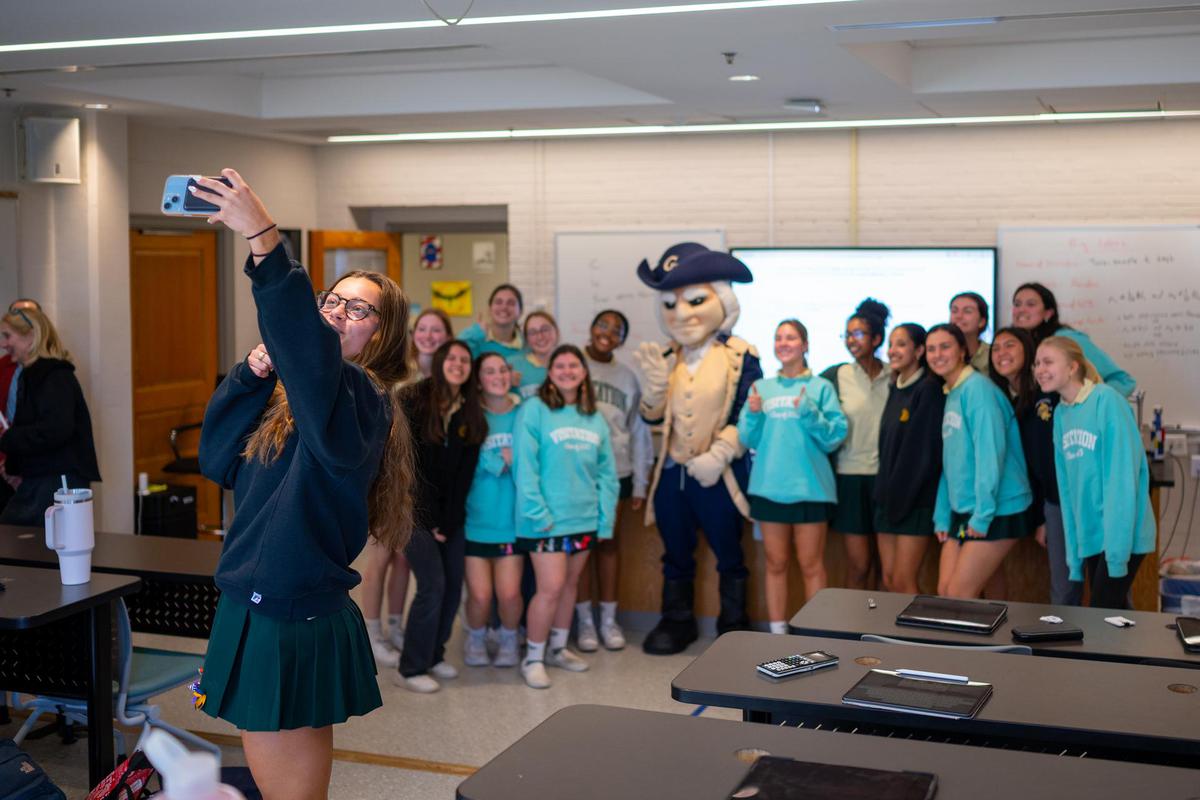 Nwachukwu’s brother, the other co-founder of the Community Upliftment Project, led her into a room filled with friends, family, teachers and school administrators. Moments after she walked in, the curtains drew on a stage holding Wrighton, her large acceptance letter, GW balloons and, of course, George the mascot.