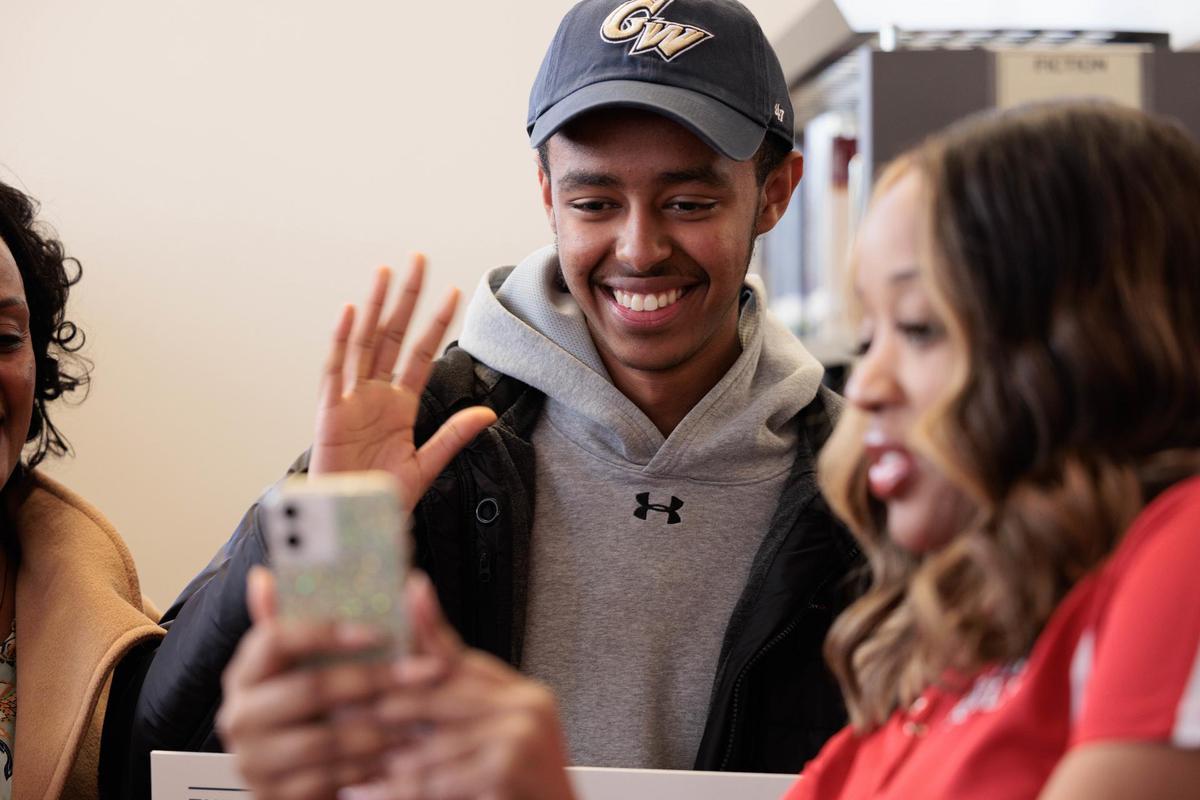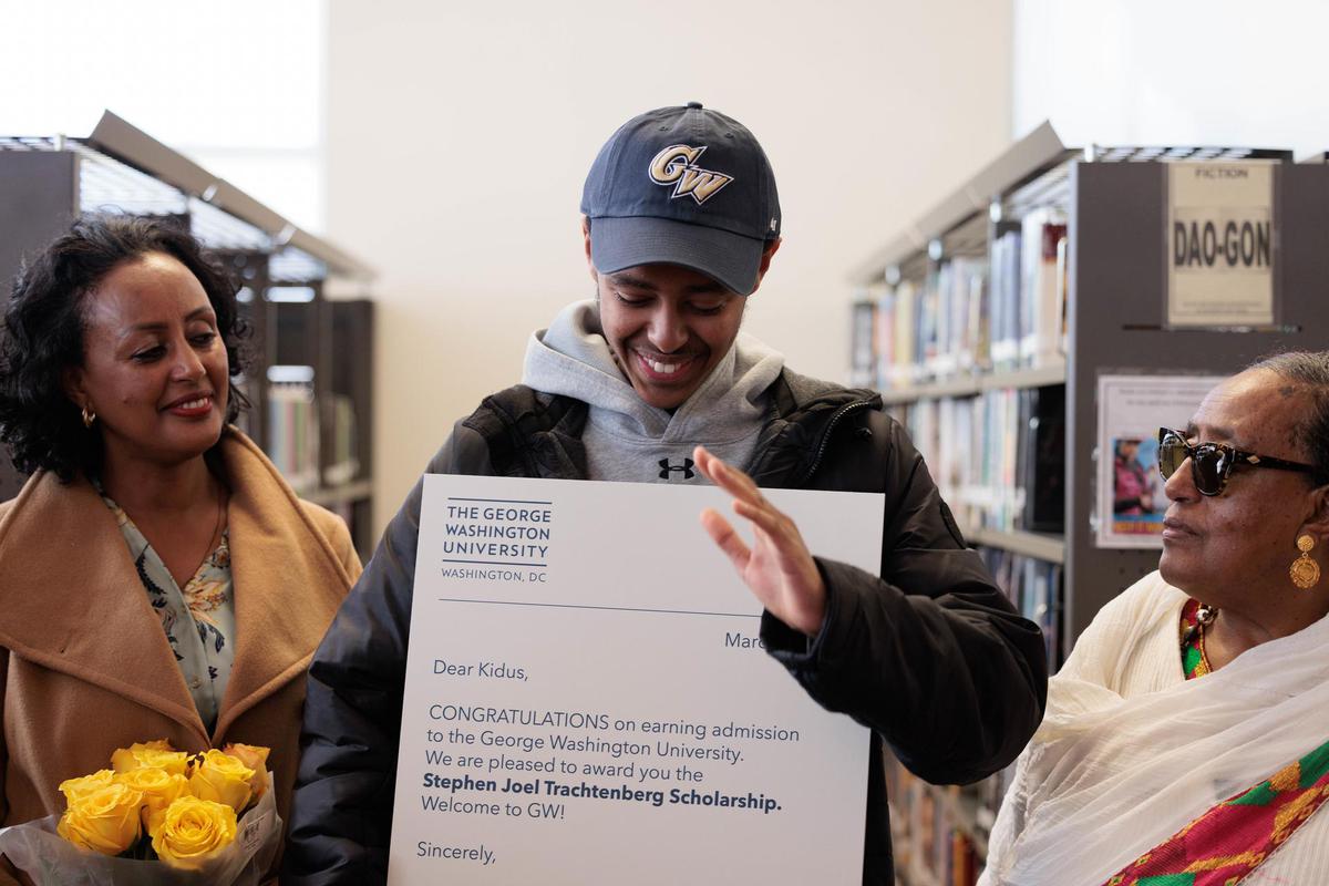 “We know that you will make important contributions not only to the community around us but also to the George Washington University, just as you have done through your time here at McKinley Technical High School,” said GW President Mark S. Wrighton, holding an oversized and signed acceptance letter for a somewhat shell-shocked Evans to hold.