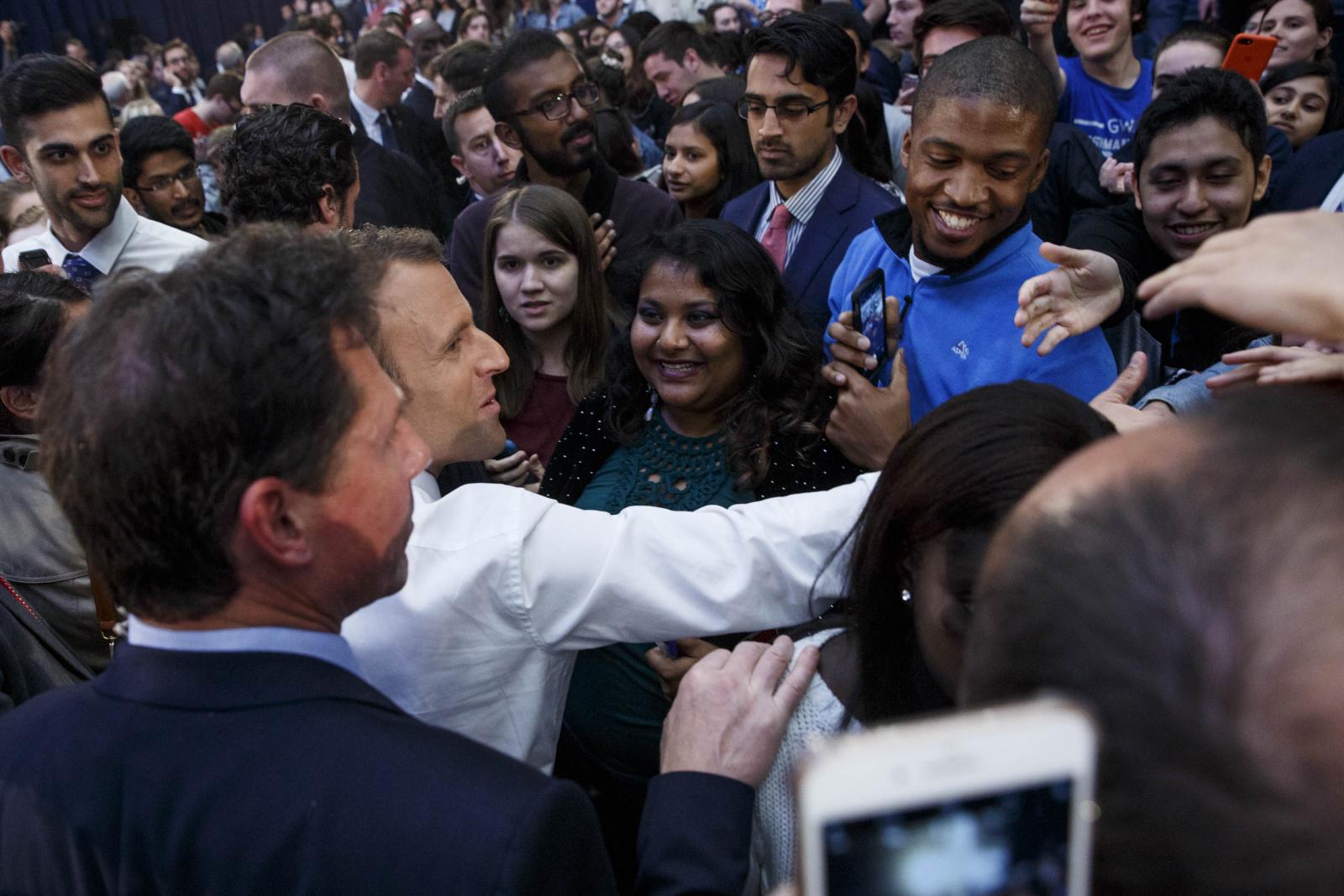Mr. Macron stopped to talk with scores of students who filled in around him as he made his way across the Foggy Bottom Campus, answering individual questions, shaking hands and signing autographs before and after the town hall.