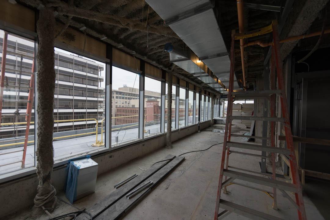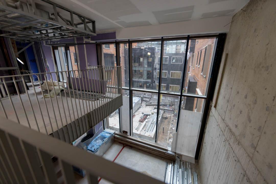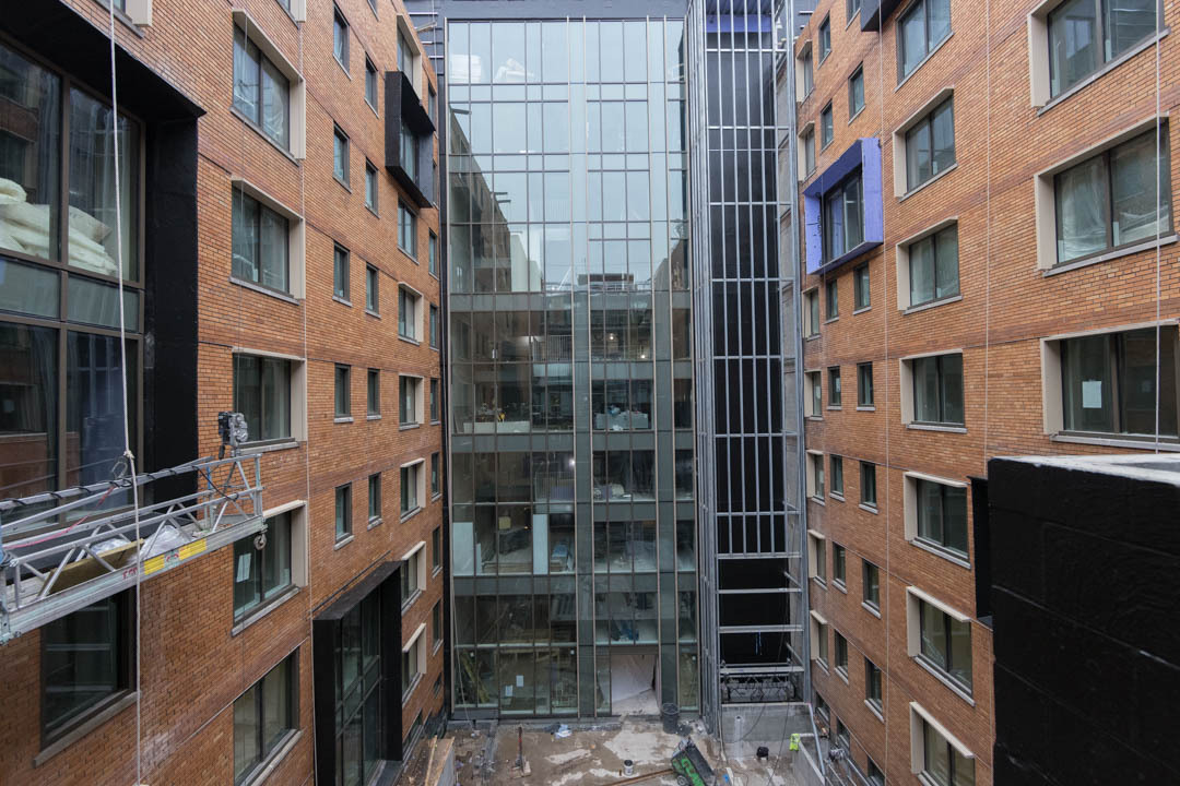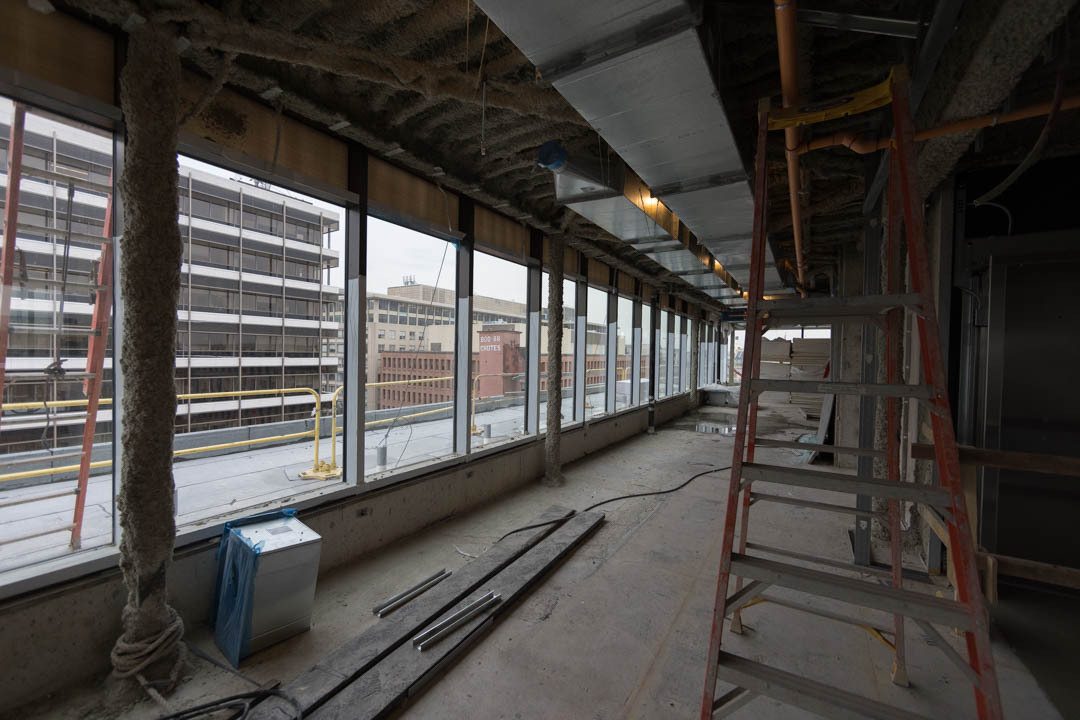 There will be 16 lounges throughout the building, including an enclosed rooftop commons that offers a sweeping, only-at-GW view of the city so students can see the Washington Monument, Eisenhower Executive Office Building and National Cathedral with one spin. Natural light will also run all the way down to the first level. At the center of it all is a wide-open courtyard that will eventually be filled with chairs, benches and other areas for students to congregate.