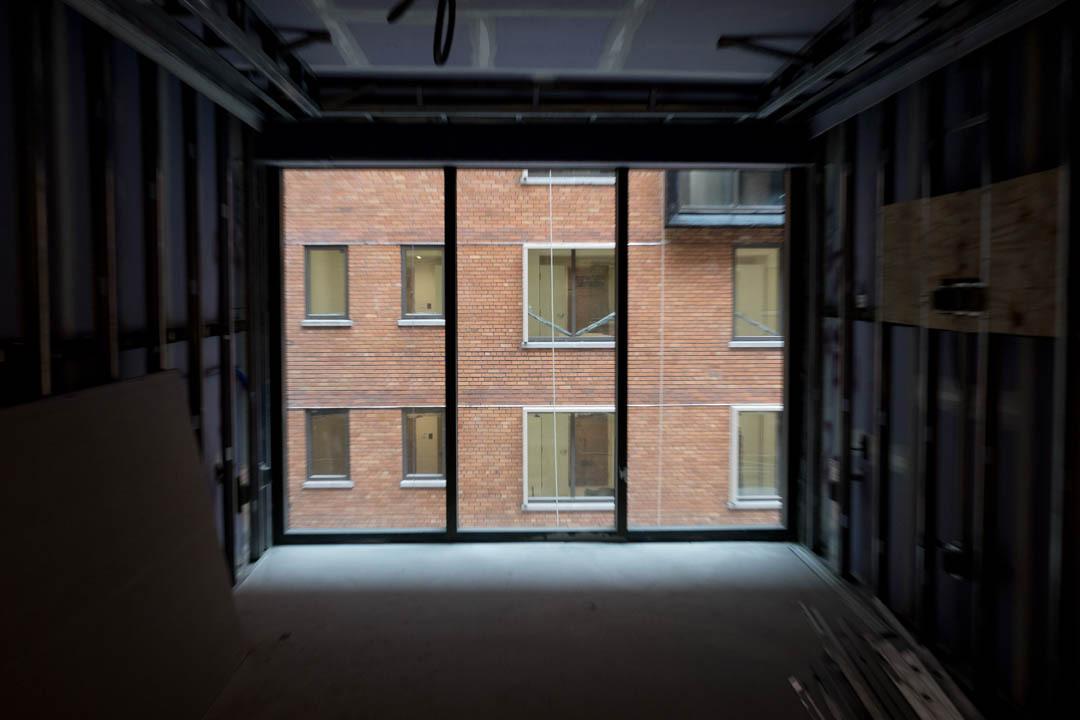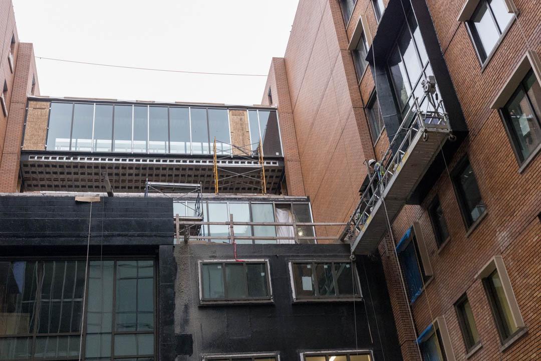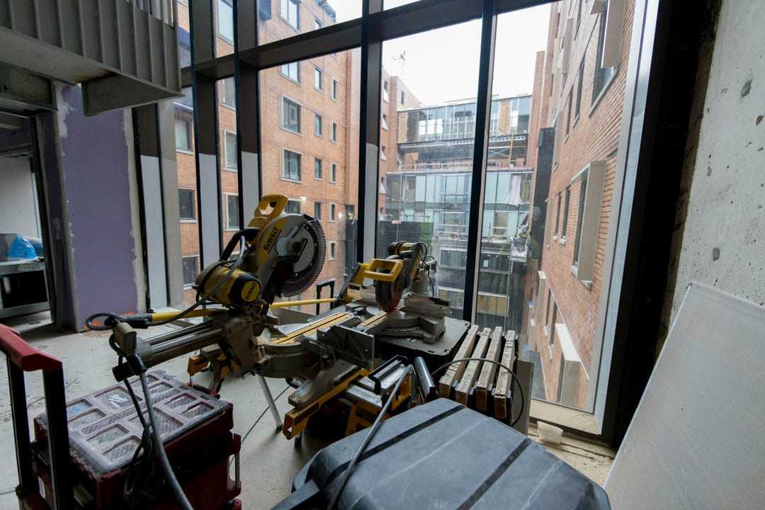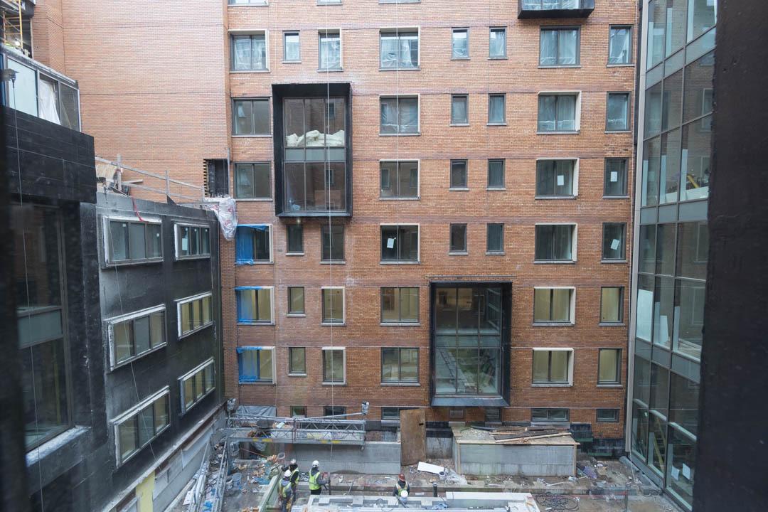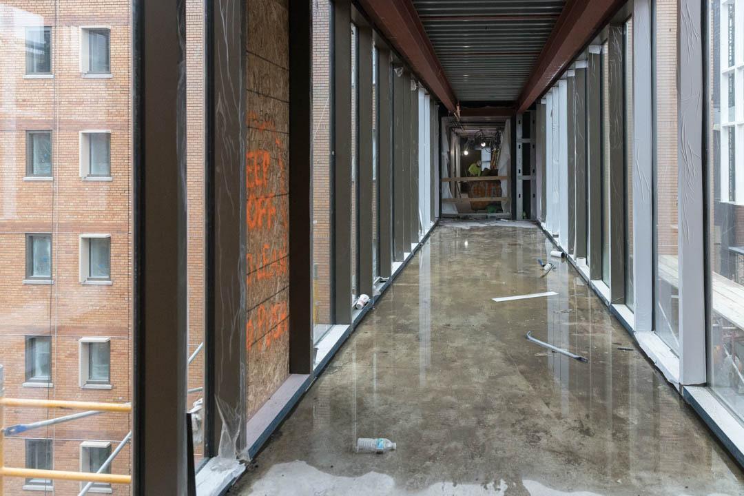 There will be 16 lounges throughout the building, including an enclosed rooftop commons that offers a sweeping, only-at-GW view of the city so students can see the Washington Monument, Eisenhower Executive Office Building and National Cathedral with one spin. Natural light will also run all the way down to the first level. At the center of it all is a wide-open courtyard that will eventually be filled with chairs, benches and other areas for students to congregate.