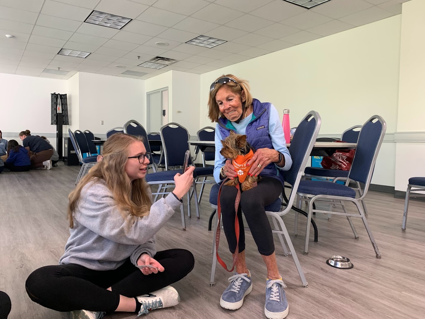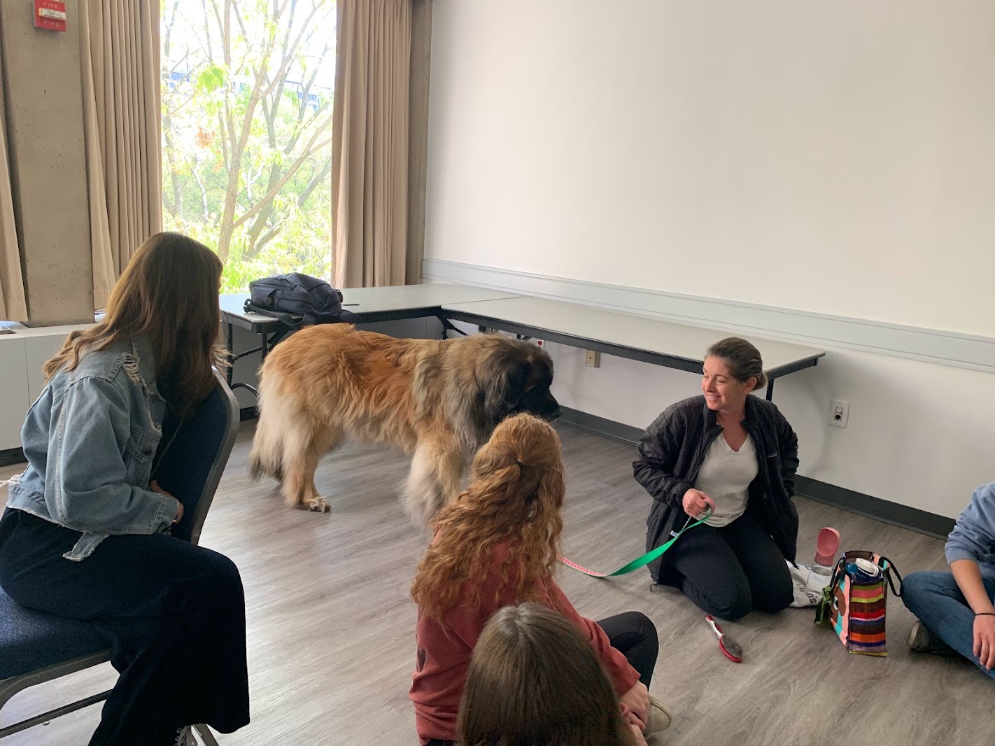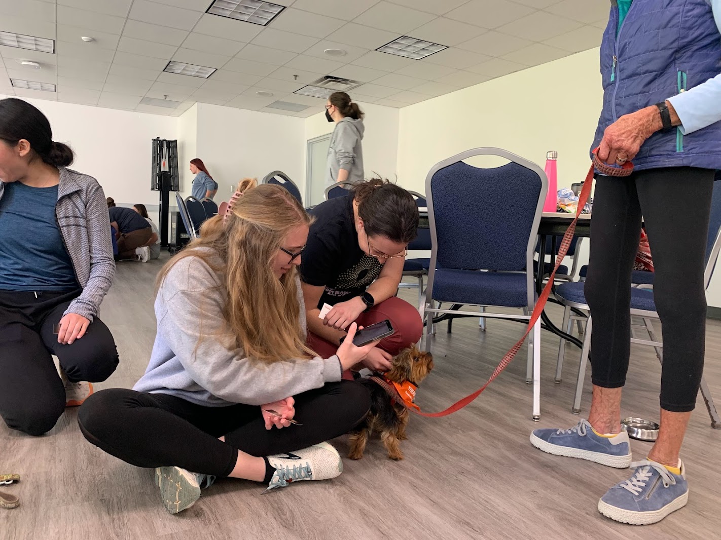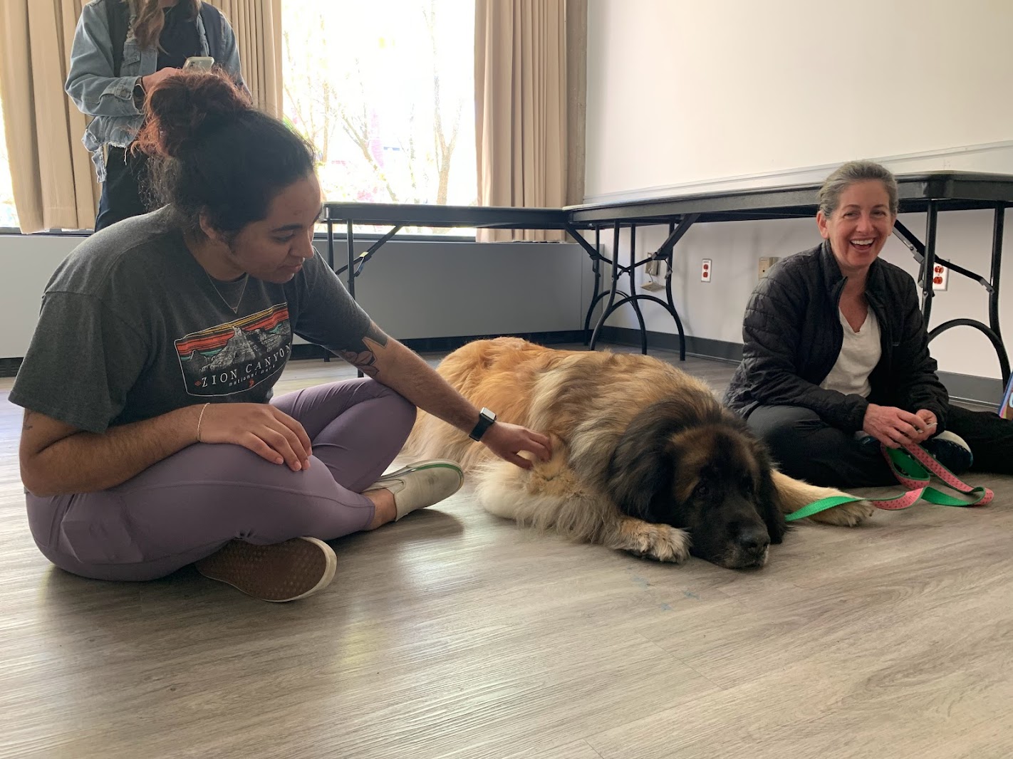 Students enjoy a moment with therapy dog Oliver Toast. (Viktoriya Karakcheyeva)