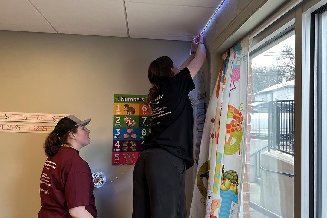 Lauren McCutcheon, a site leader who worked on the logistics for the visit to Horton’s Kids, works up to 15 hours a week at GW Jumpstart. “I’m passionate about kids,” she said. She worked with Addie Froula, a sophomore studying international affairs and economics, to string up the LED lights.”