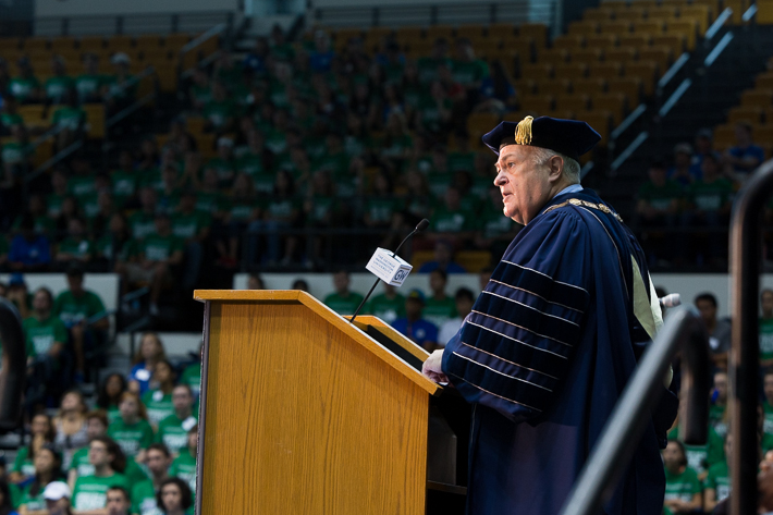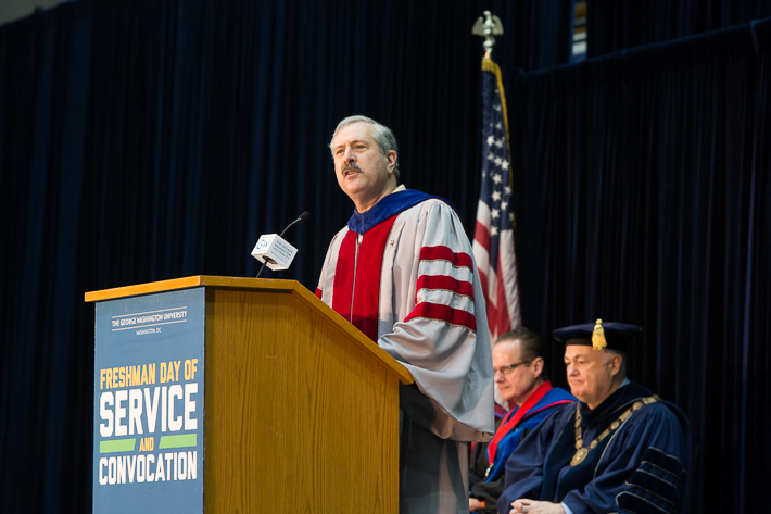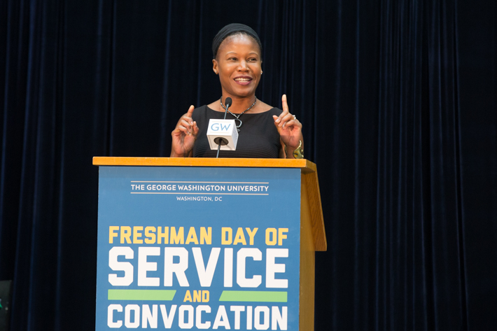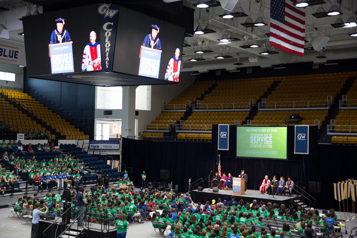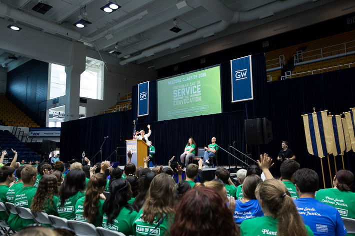 GW volunteers, including members of the class of 2018, attended a Saturday morning convocation at the Charles E. Smith Center that featured remarks from Dr. Knapp, Provost and Executive Vice President for Academic Affairs Steven Lerman, My Good Deed co-founder Jay Winuk, Corporation for National and Community Service CEO Wendy Spencer and urban revitalization strategist Majora Carter.
