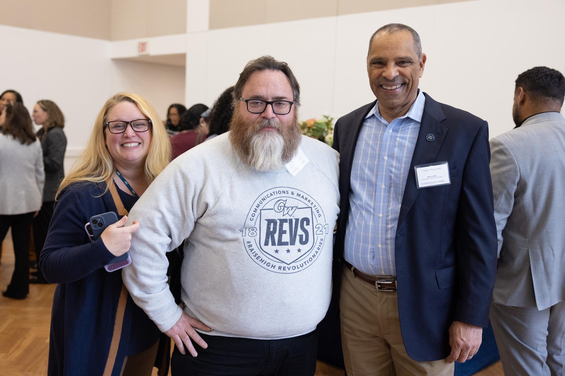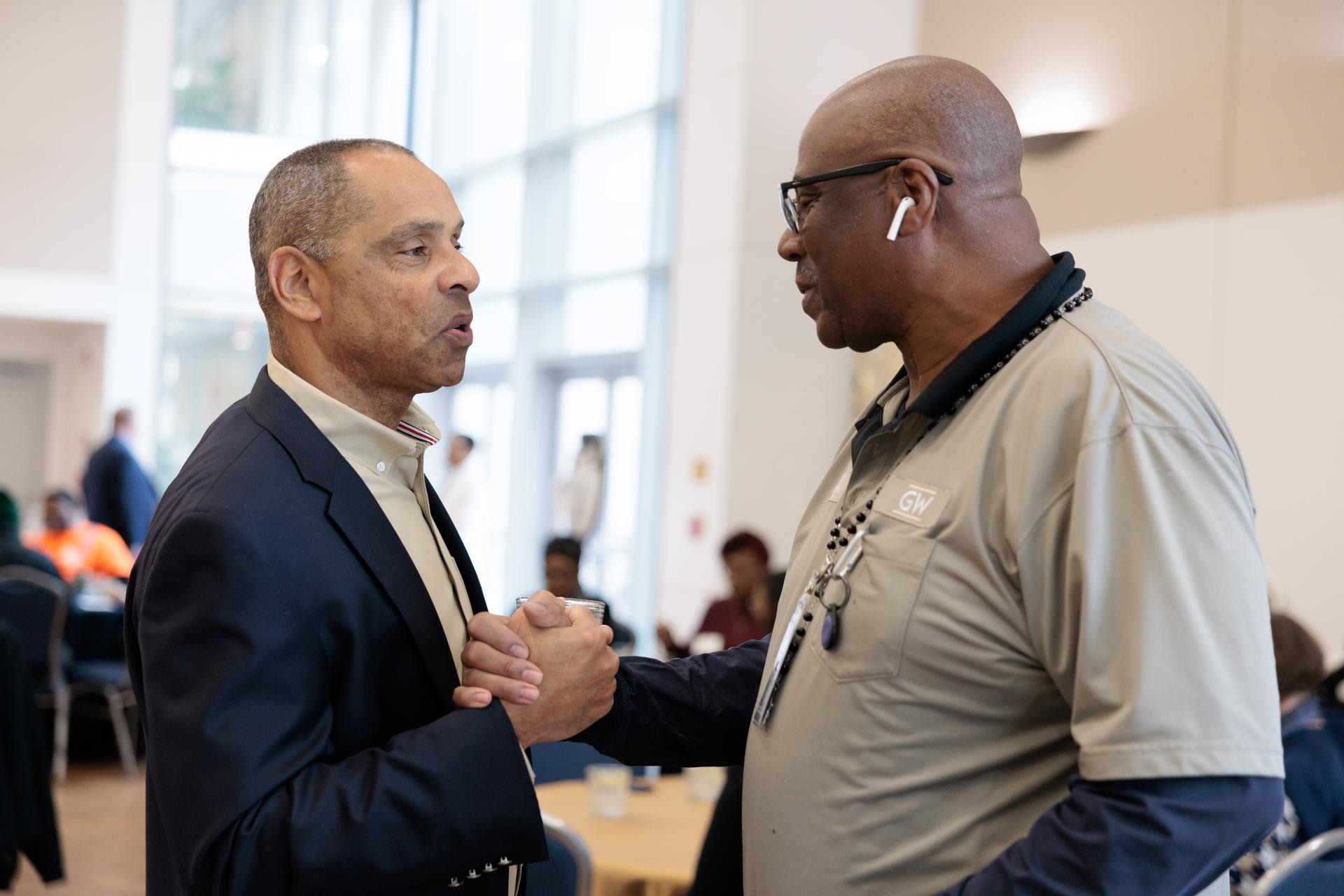 She then specially recognized those staff members in attendance celebrating 40 years or more of service, including Andrew Moskowitz of GW Information Technology for 40 years; Hayes, Jackson and Vivian Waltson of the Office of the Executive Vice President, Chief Financial Officer and Treasurer for 45 years; and Carl Bryant of the Division of Safety and Operations for 50 years. These recipients received a commemorative pin.