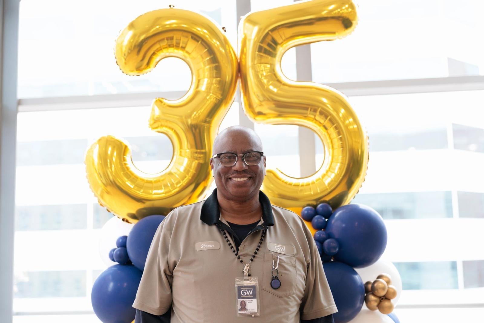 But in the four-and-a-half decades since, they’ve become fierce teammates and friends working together in the Division of Safety and Operations. And on Wednesday, GW jointly honored them for their 45 years of service to the university in the annual Career Milestones luncheon for staff, held this year in the University Student Center’s Grand Ballroom. Those celebrating 20, 25, 30, 35, 40, 45 and even 50 years were honored Wednesday, while staff marking 15, 10 and five years were celebrated Thursday.
