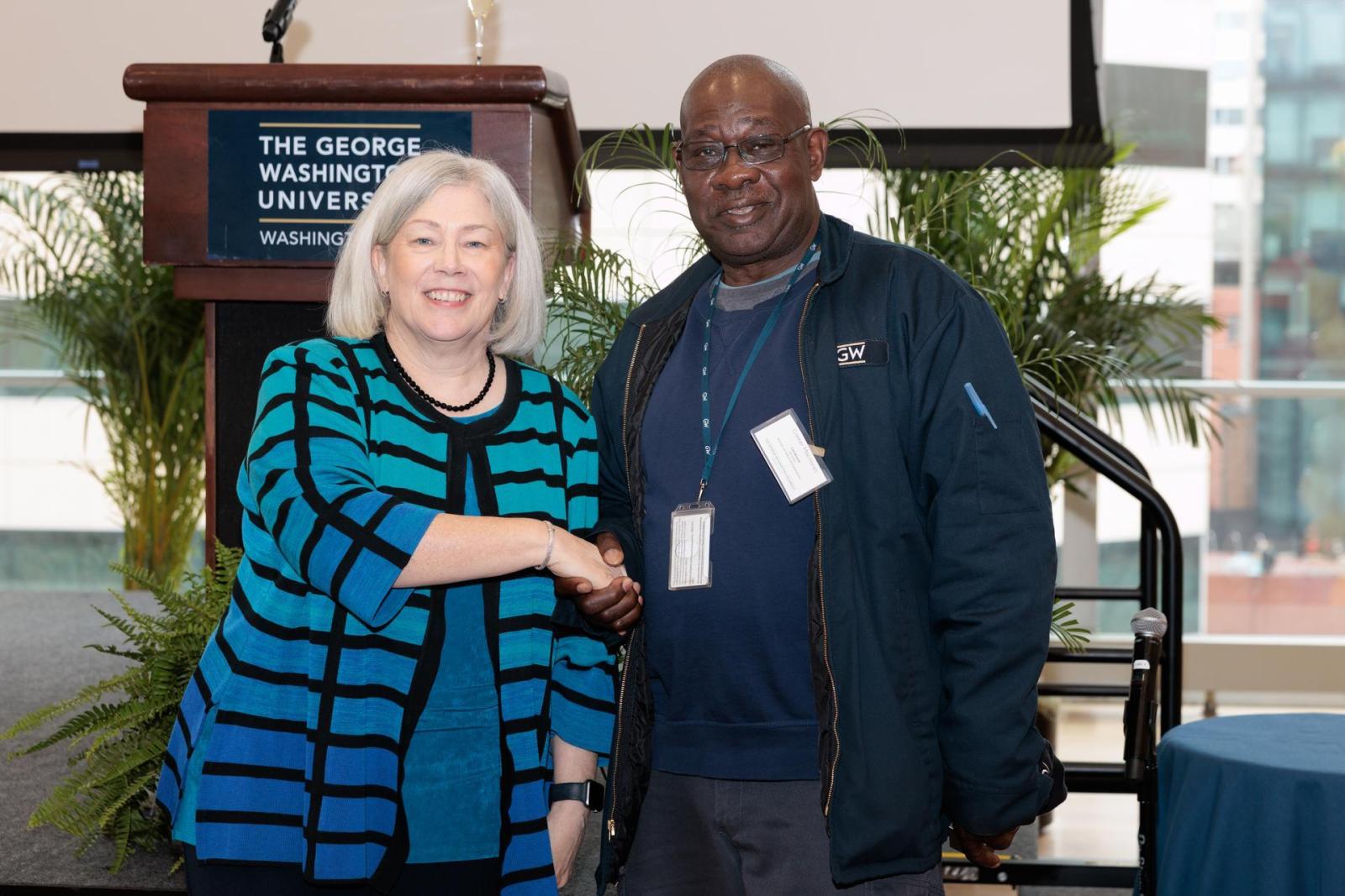 She then specially recognized those staff members in attendance celebrating 40 years or more of service, including Andrew Moskowitz of GW Information Technology for 40 years; Hayes, Jackson and Vivian Walston of the Office of the Executive Vice President, Chief Financial Officer and Treasurer for 45 years; and Carl Bryant of the Division of Safety and Operations for 50 years. These recipients received a commemorative pin.