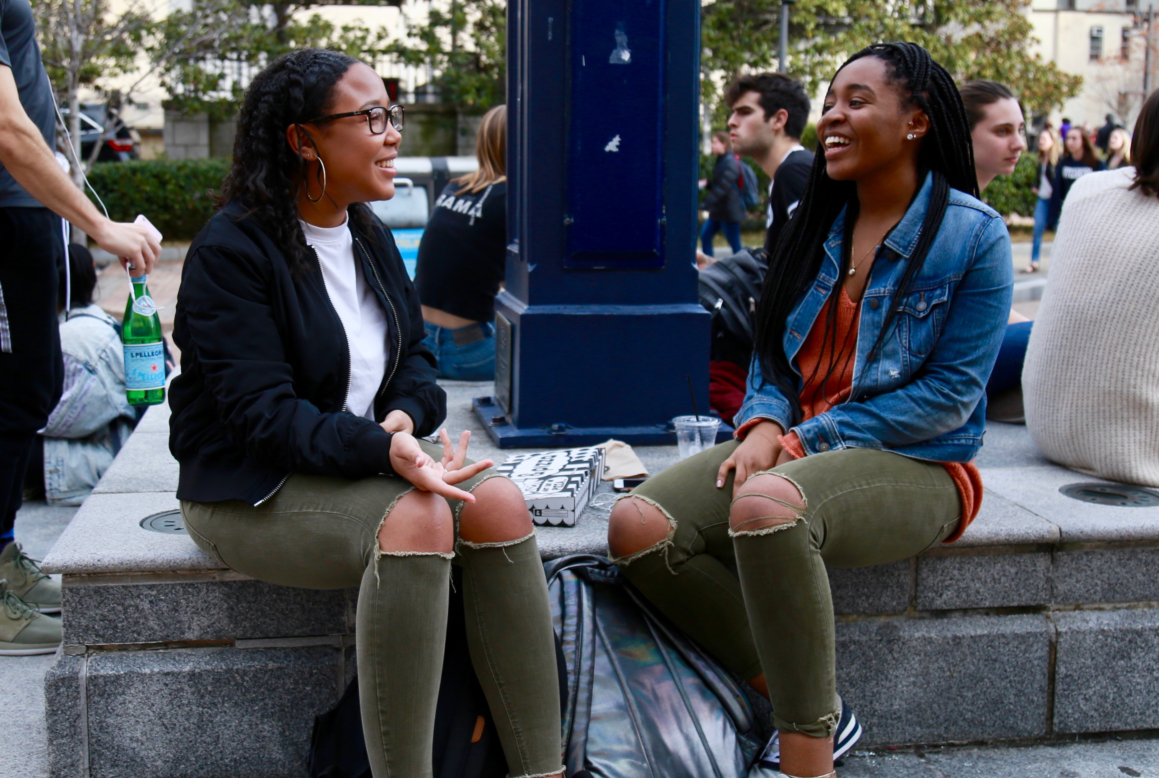 Theo Magill and Biz Rhoads, both freshman, enjoy the weather outside of Lisner Auditorium. (Photos: Briahnna Brown/GW Today)