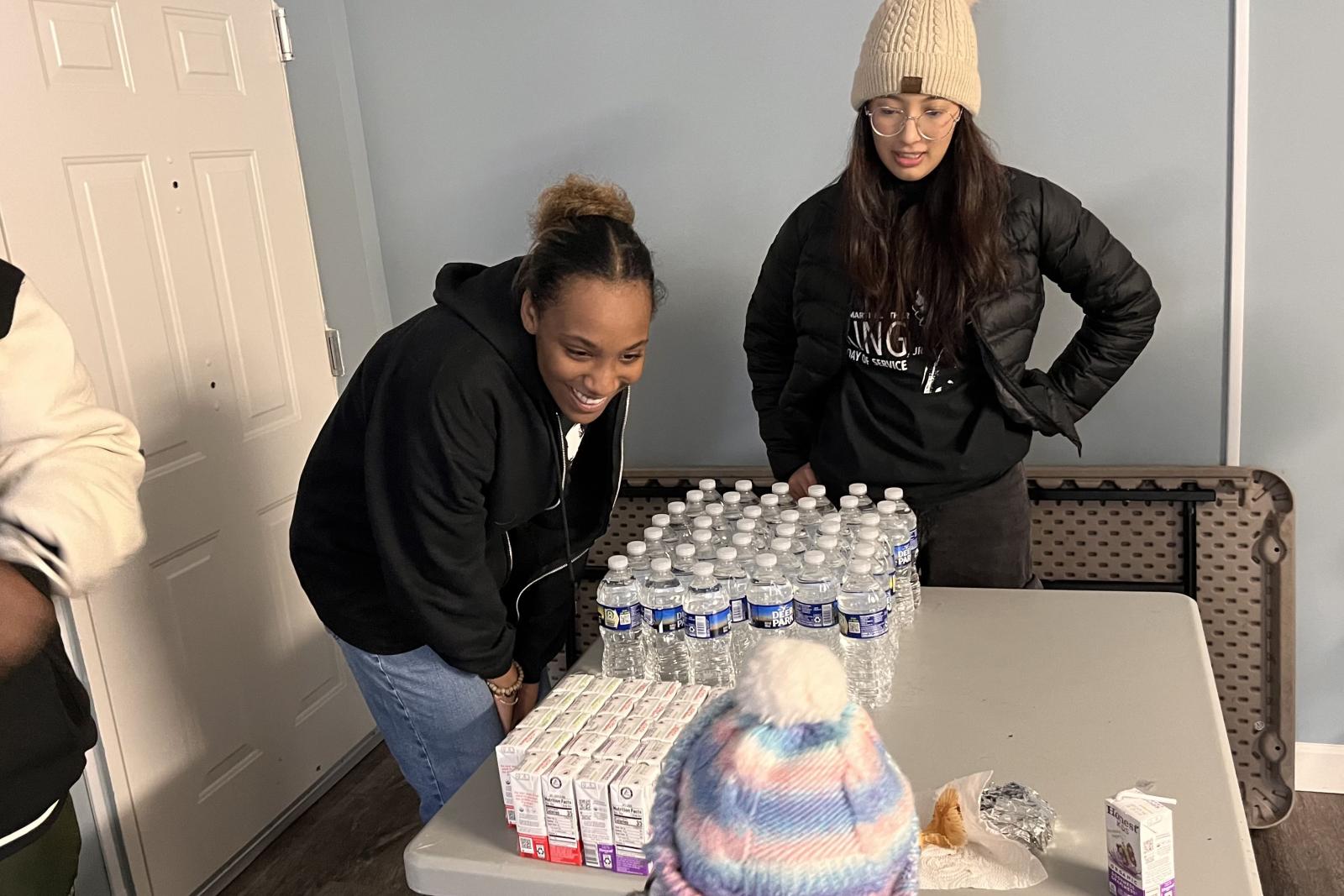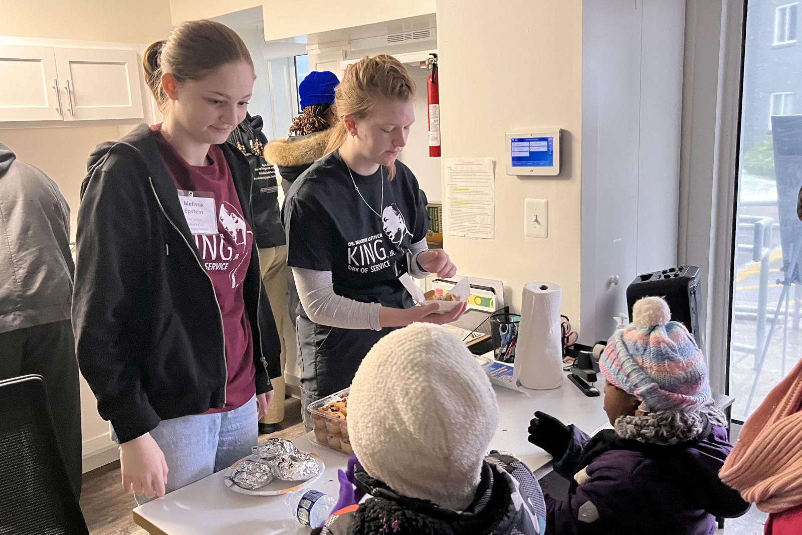 A few minutes away at Horton’s Kids center in the Stanton Oaks housing complex, junior Melissa Epstein, sophomore Meghan Montgomery and other GW students jumped right in, setting up tables, warming biscuit and cheese sausage sandwiches, and laying out muffins and juice boxes for children from the neighborhood who lined up for lunch.