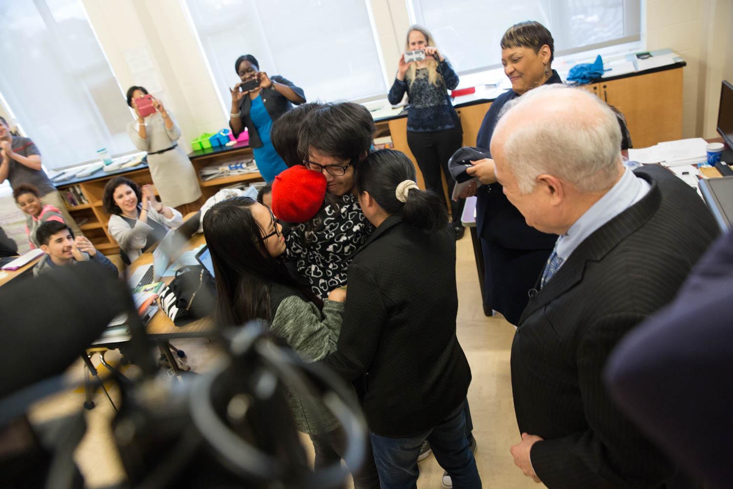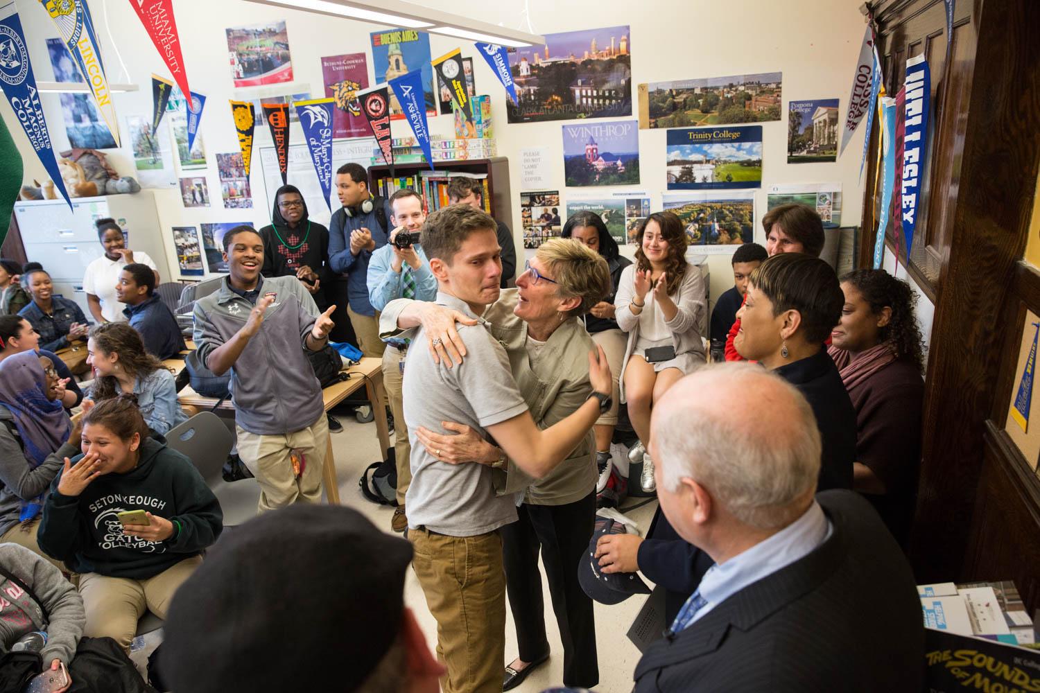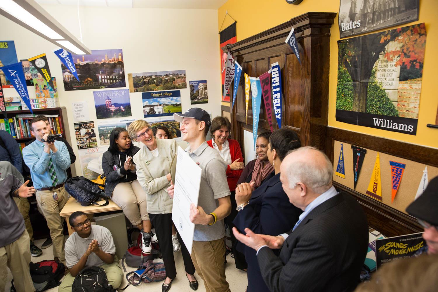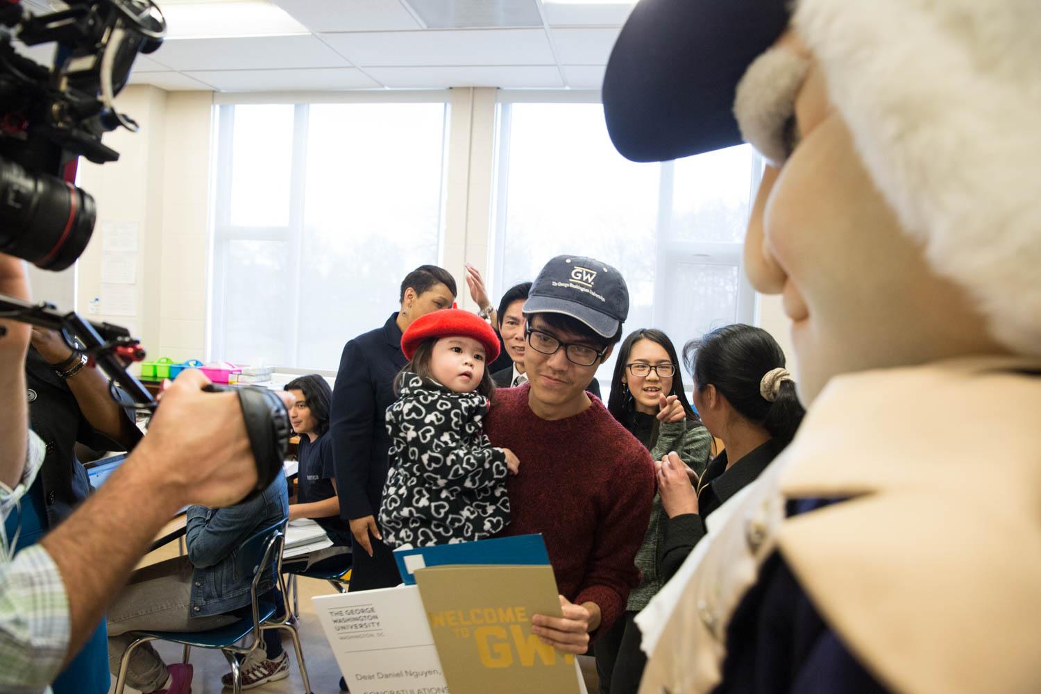 All day on Thursday, the GW scholarship team—comprising Dr. Knapp, Ms. Felton, George the mascot and admissions staff—covertly entered high school classrooms and auditoriums across the city to surprise students with full ride scholarships to GW. The “prize patrol” hand-delivered acceptances to 10 students at eight schools across Washington, D.C., bringing along the winners’ families and loved ones to capture the excitement of a dream come true.