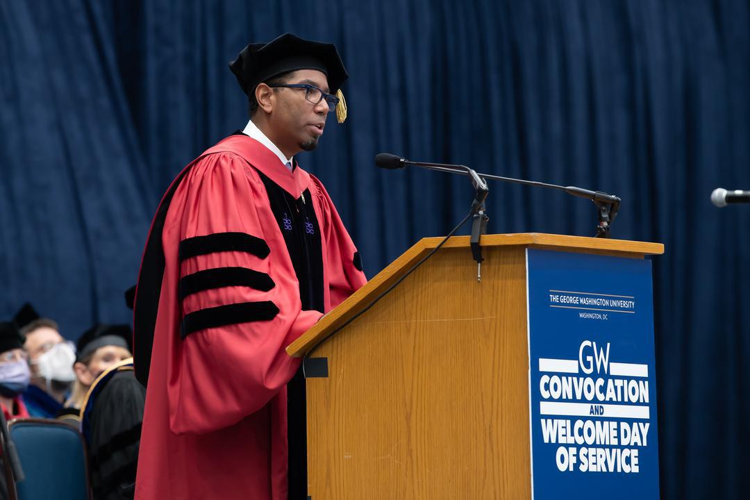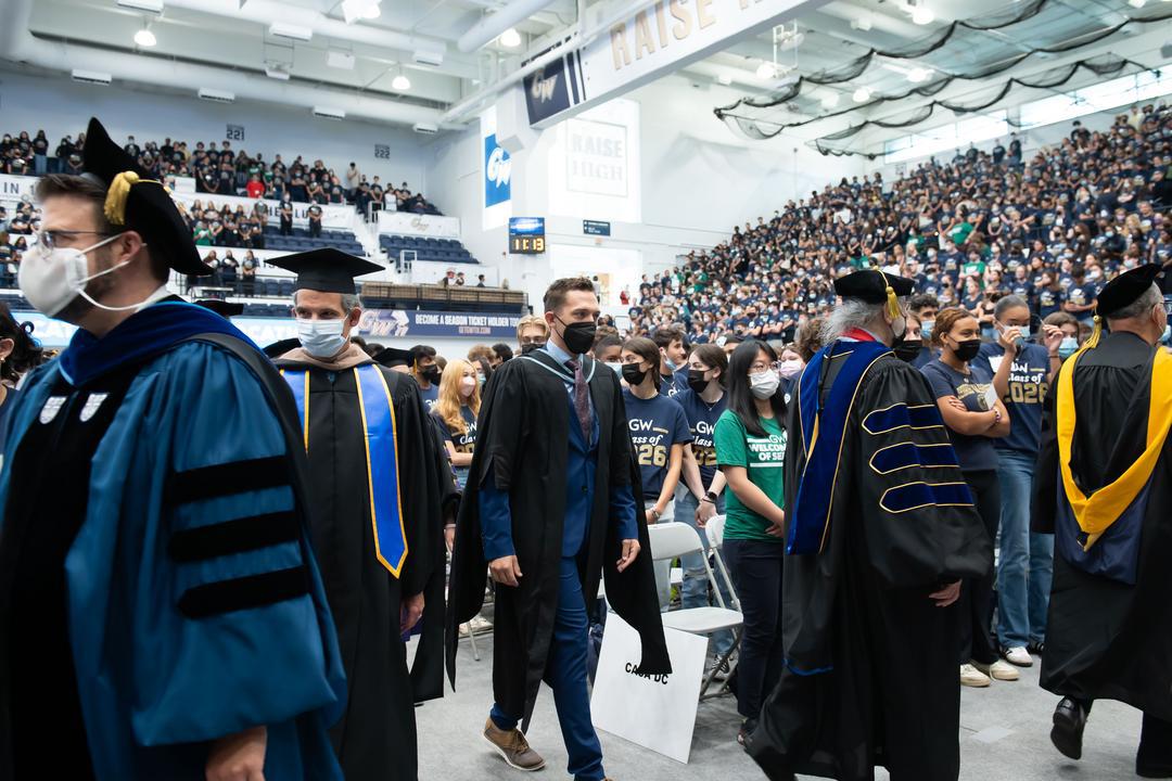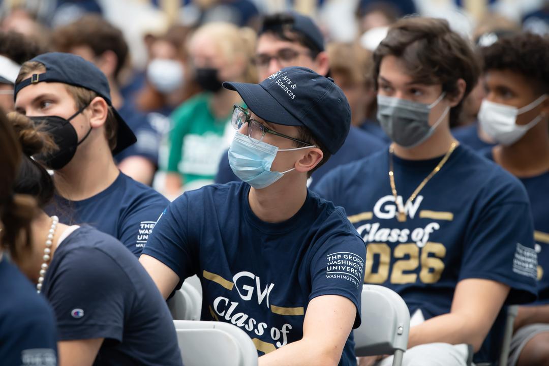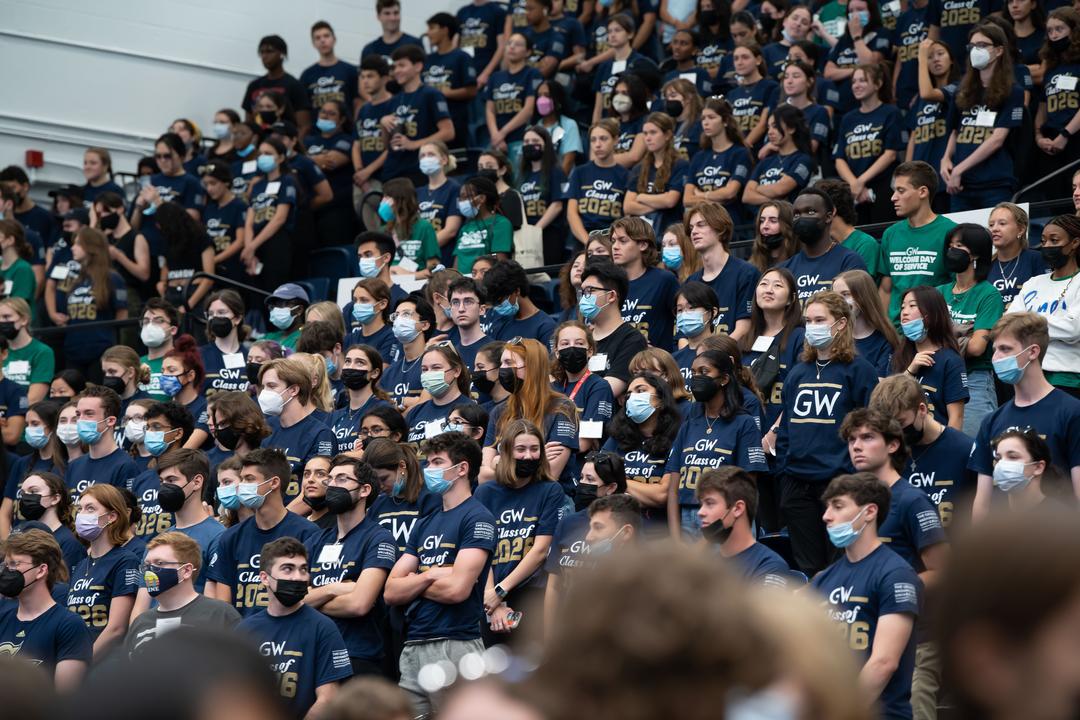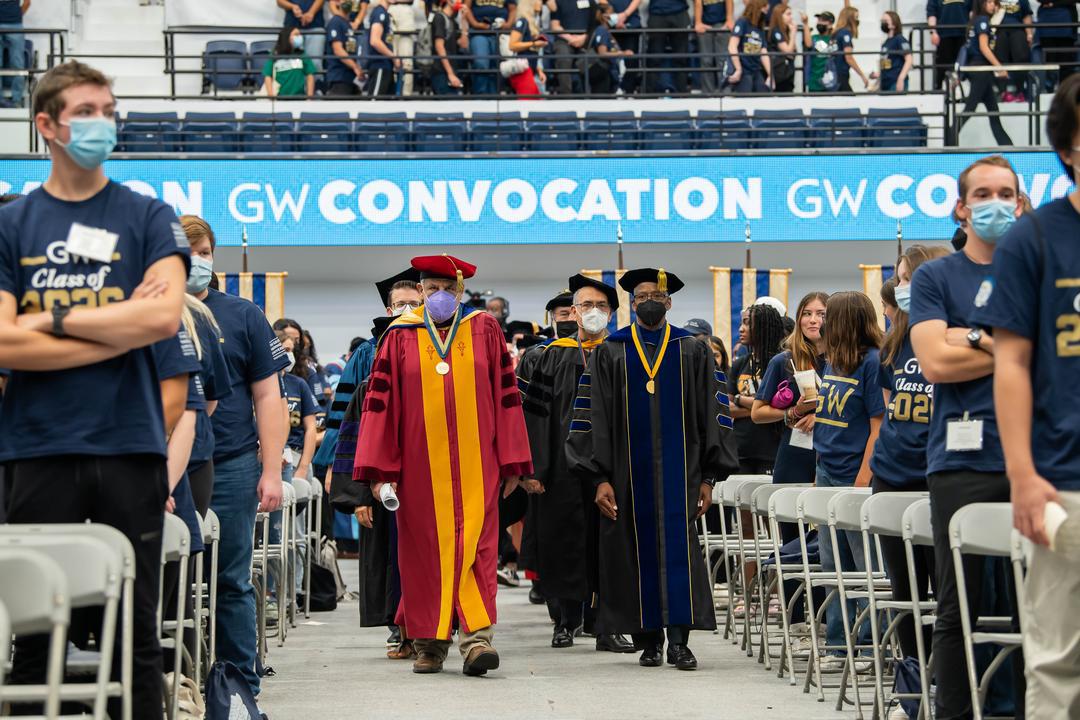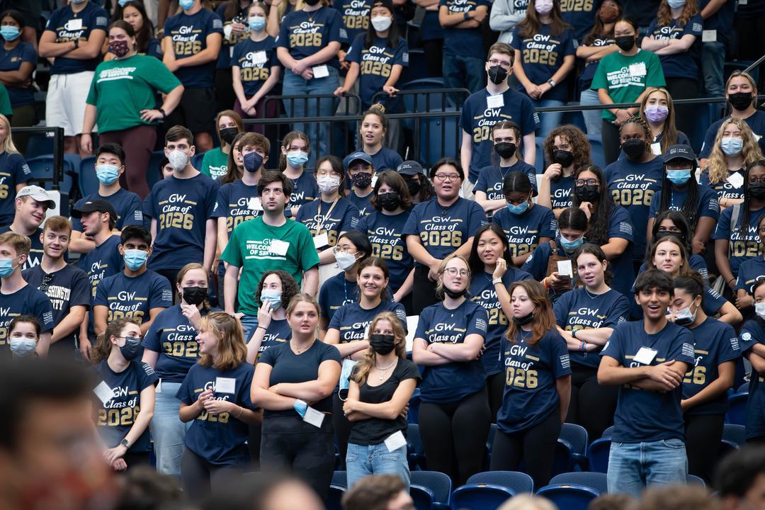 While the George Washington University’s Class of 2026 was celebrated in a jovial ceremony—complete with renditions of the GW Fight Song and Alma Mater during Saturday’s Convocation at the Charles E. Smith Center, the school’s first-year students were also challenged to utilize the resources now available to them to make positive change in a world that needs it.