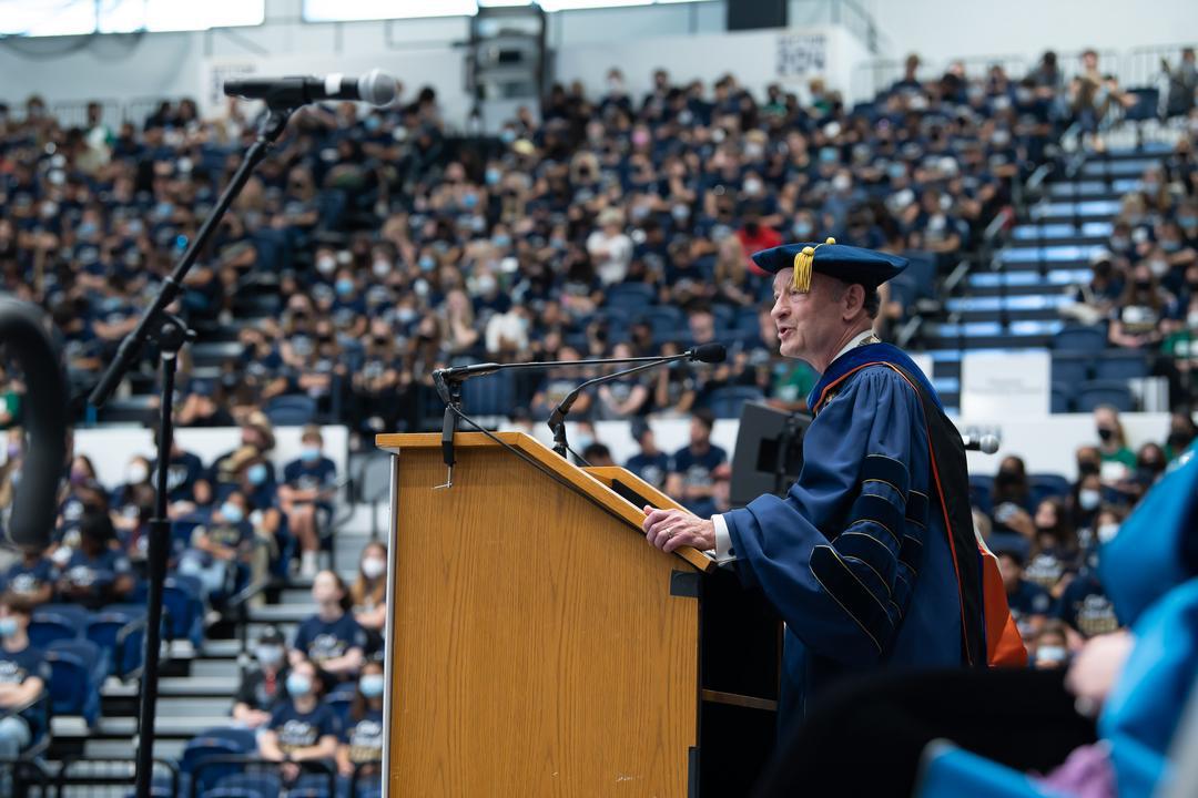 Speaking to first-year students just days before the start of the 2022-23 academic year for undergraduate students, President Mark S. Wrighton urged the GW first-year and transfer students to continue strengthening the university’s engaged, inclusive and intellectual community.
