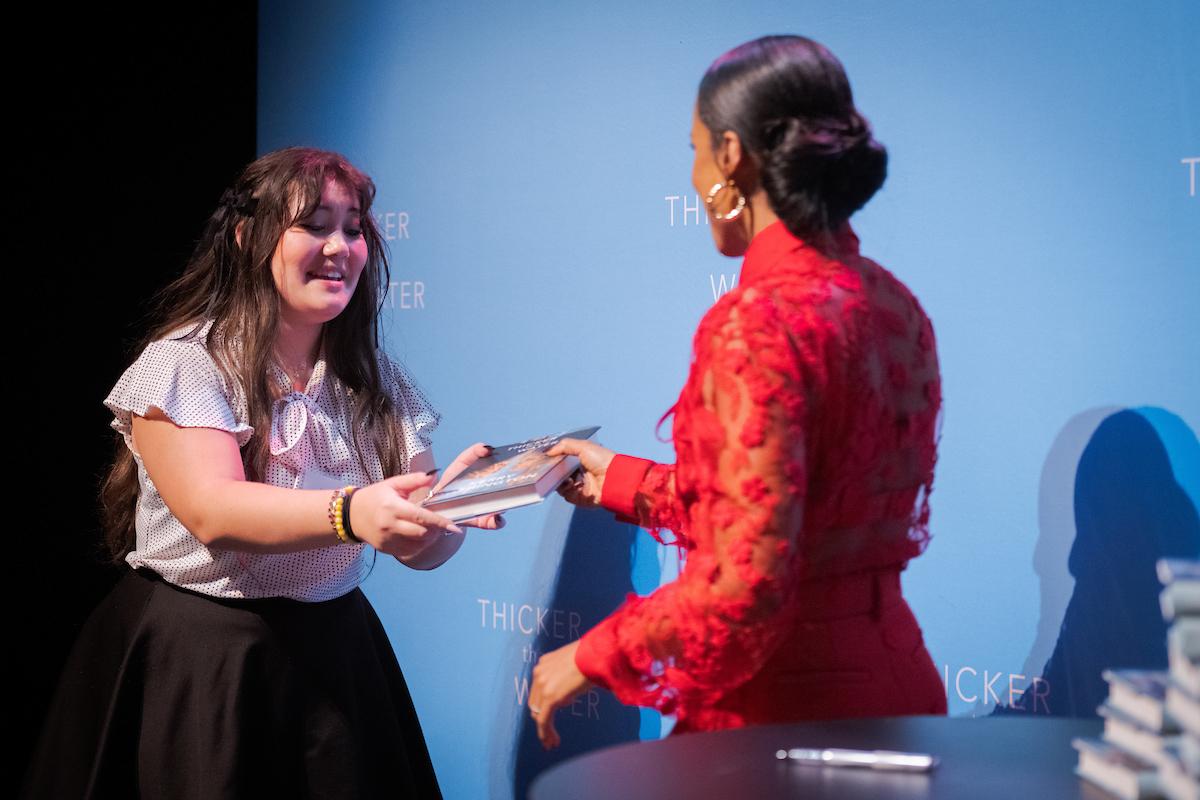 Washington, B.A. ‘98; HON ‘13, kicked off a whirlwind evening at GW with the invite-only event for students from the Corcoran School of the Arts and Design’s Department of Theatre and Dance, housed within the Columbian College of Arts and Sciences. After a wide-ranging and insightful conversation with Corcoran Director Lauren Onkey, Washington not only answered students’ questions but surprised every student with a copy of her autobiography, “Thicker than Water,” and spent almost an hour signing books and taking photos with attendees.