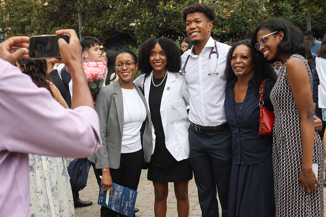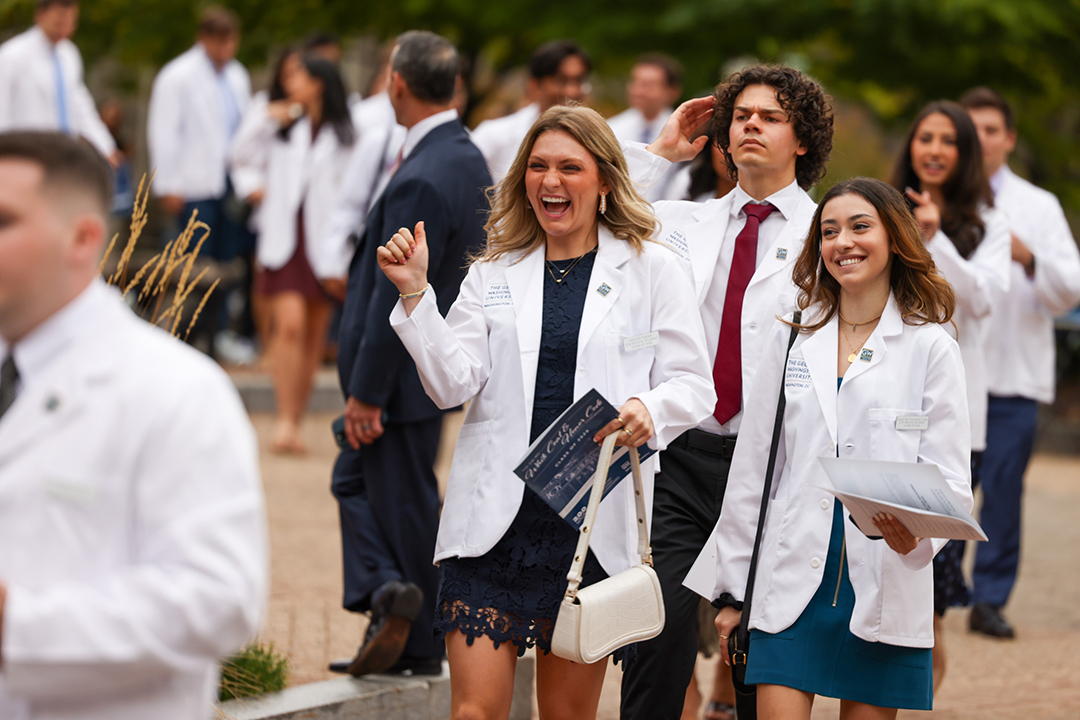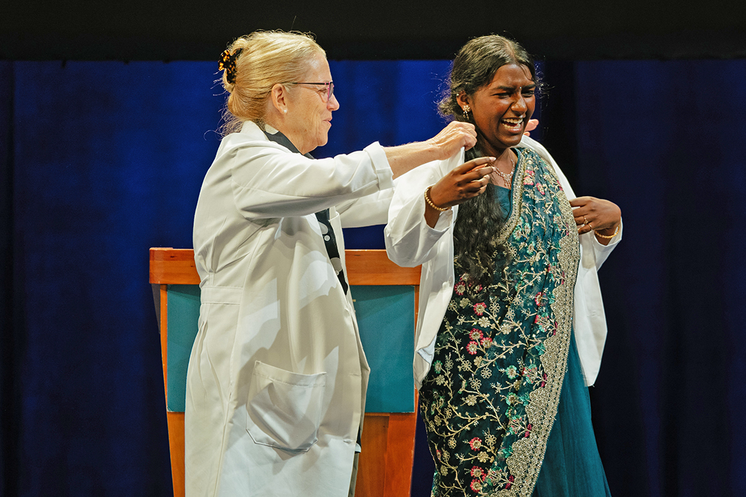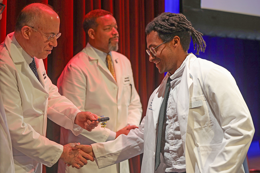 Continuing a 26-year tradition, first-year SMHS medical students received a commemorative reflex hammer, recited the SMHS oath, signed an honor code, and pledged their commitment to medicine, with family, friends and future colleagues as their witnesses. Beyond the remarks and the pageantry of the annual rite of passage, the highlight is always the receipt of their first short white coats, marking the official start of their medical careers.