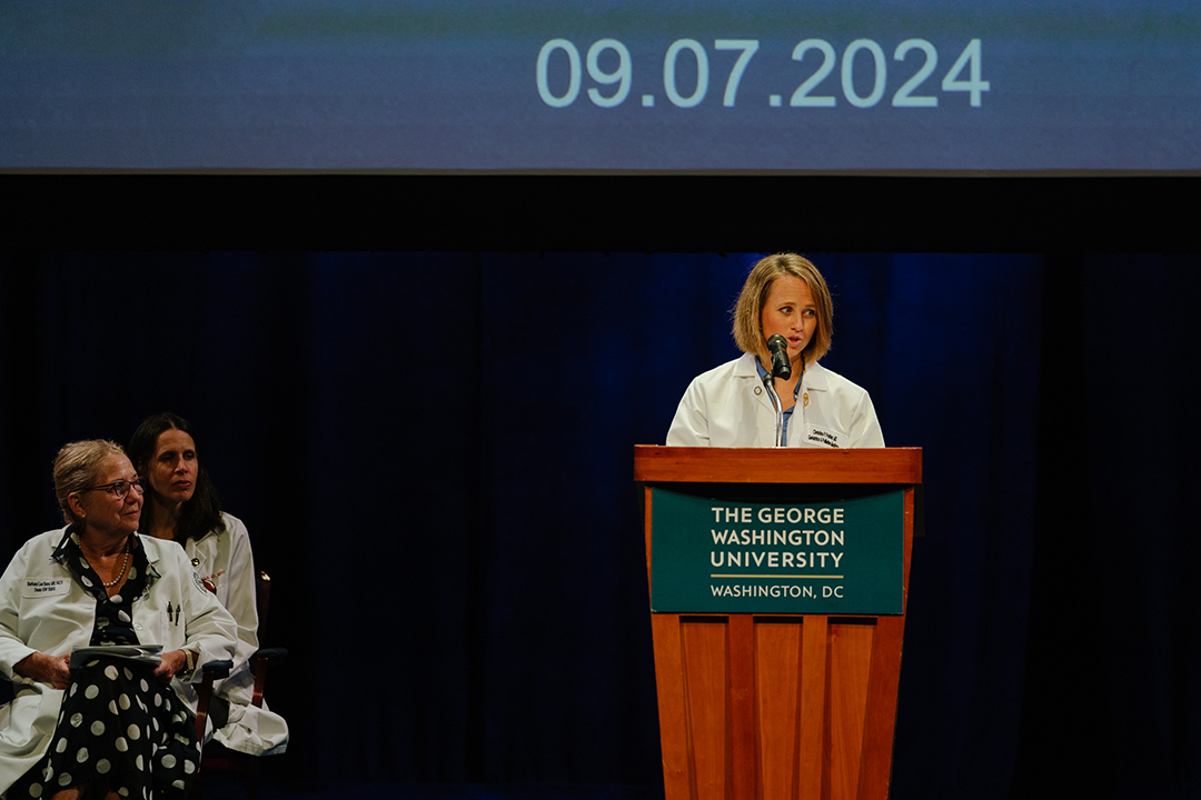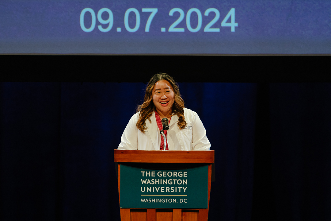 Stepping to the podium at Lisner Auditorium to deliver the keynote address for the George Washington University School of Medicine and Health Sciences (SMHS) 26th Annual White Coat and Honor Code Ceremony on Sept. 7, Christina Prather encouraged the medical doctor program Class of 2028 and their family members in attendance to reflect on those values.