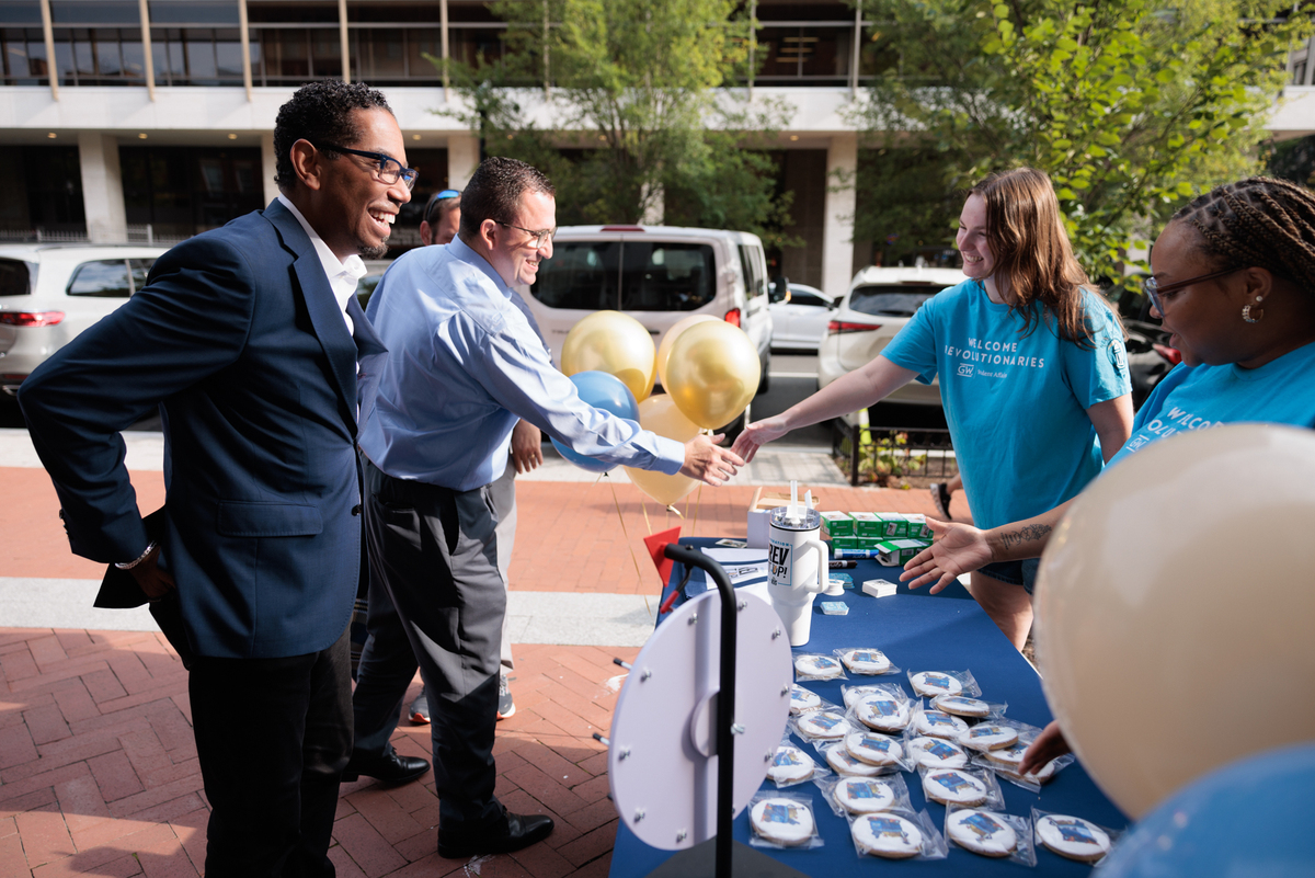 At Thurston Hall on Friday, GW President Ellen Granberg led a welcoming committee that included her wife, Sonya Rankin, staff and the Vice Provost for Student Affairs and Dean of Students Colette Coleman.