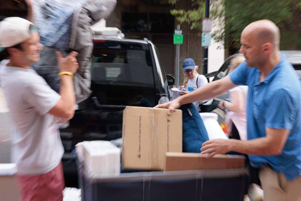Friday was the first of two days where first-year students not in pre-orientation programming were allowed to move in. Scores of students, followed by siblings, parents and supporters, lined the walkway in front of Thurston Hall, setting up a gridlock at the elevator, with GW students serving as bellhops and Student Affairs and other staff lending assistance with bins, and removing packaging material. Water, fresh drinks and chips kept the energy up.