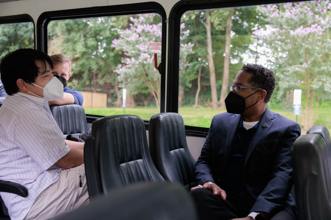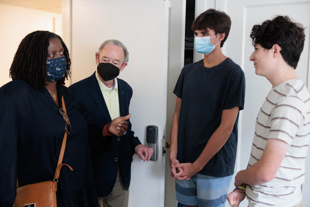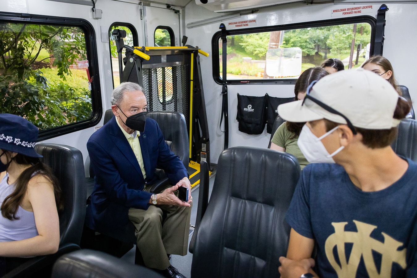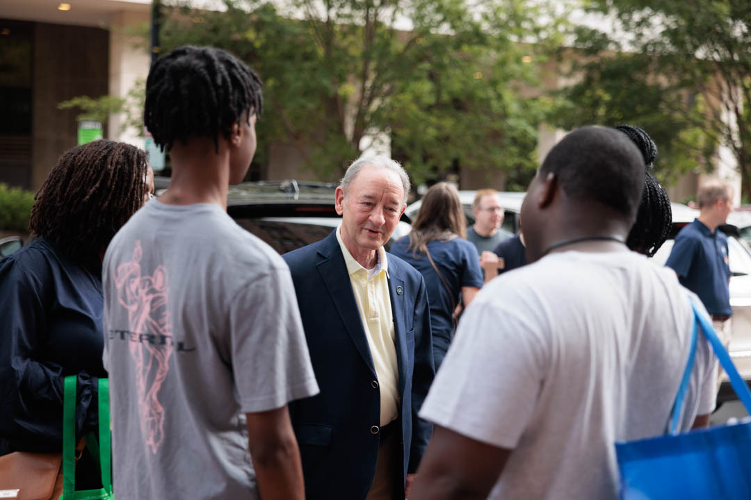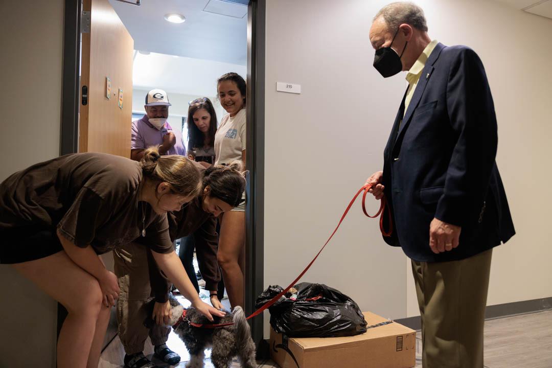 GW President Mark S. Wrighton, Provost Christopher Alan Bracey and Vice Provost for Student Affairs and Dean of Students Colette Coleman, among other leadership, greeted students moving in—as well as their families—outside Thurston Hall on Sunday morning before heading over to other residence halls both on the Foggy Bottom and Mount Vernon campuses. Wrighton’s dog, Spike, accompanied him on his morning route and throughout the halls, providing a much-welcomed break from the unpacking and assembling.