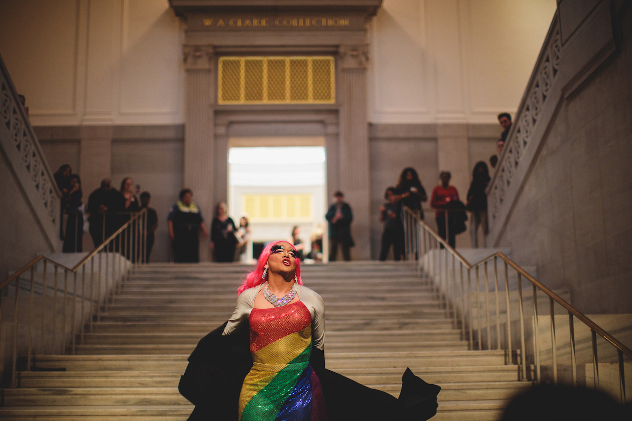 Art from the comic filled the wall of one gallery, but that wasn’t Mr. Mata’s only NEXT contribution. Pink-wigged and heavily lashed, clad in a showstopping rainbow gown, Mr. Mata took to the Flagg Building’s marble steps and—flanked by two backup dancers—danced to Sia’s “The Greatest” before a cheering crowd.
