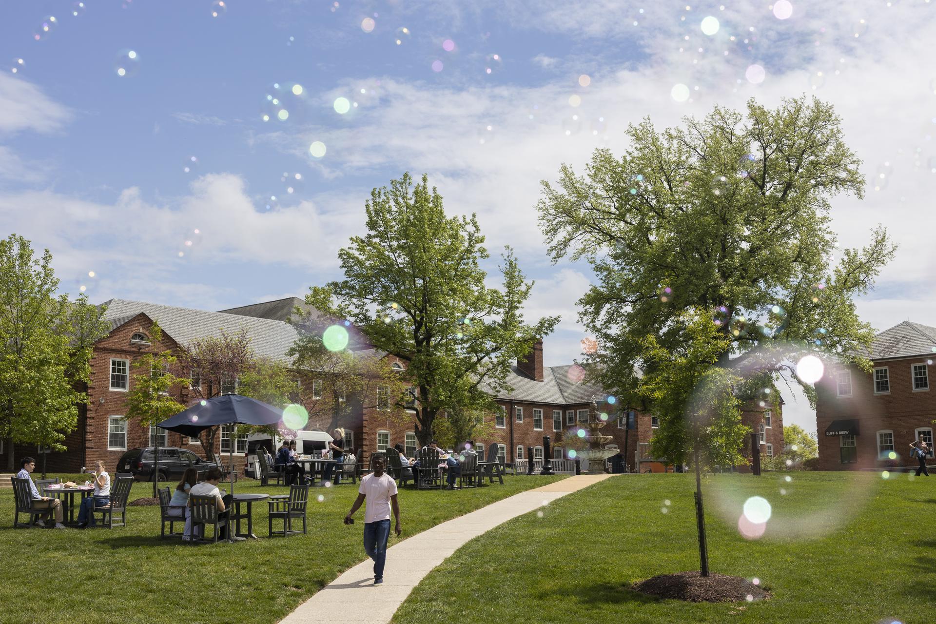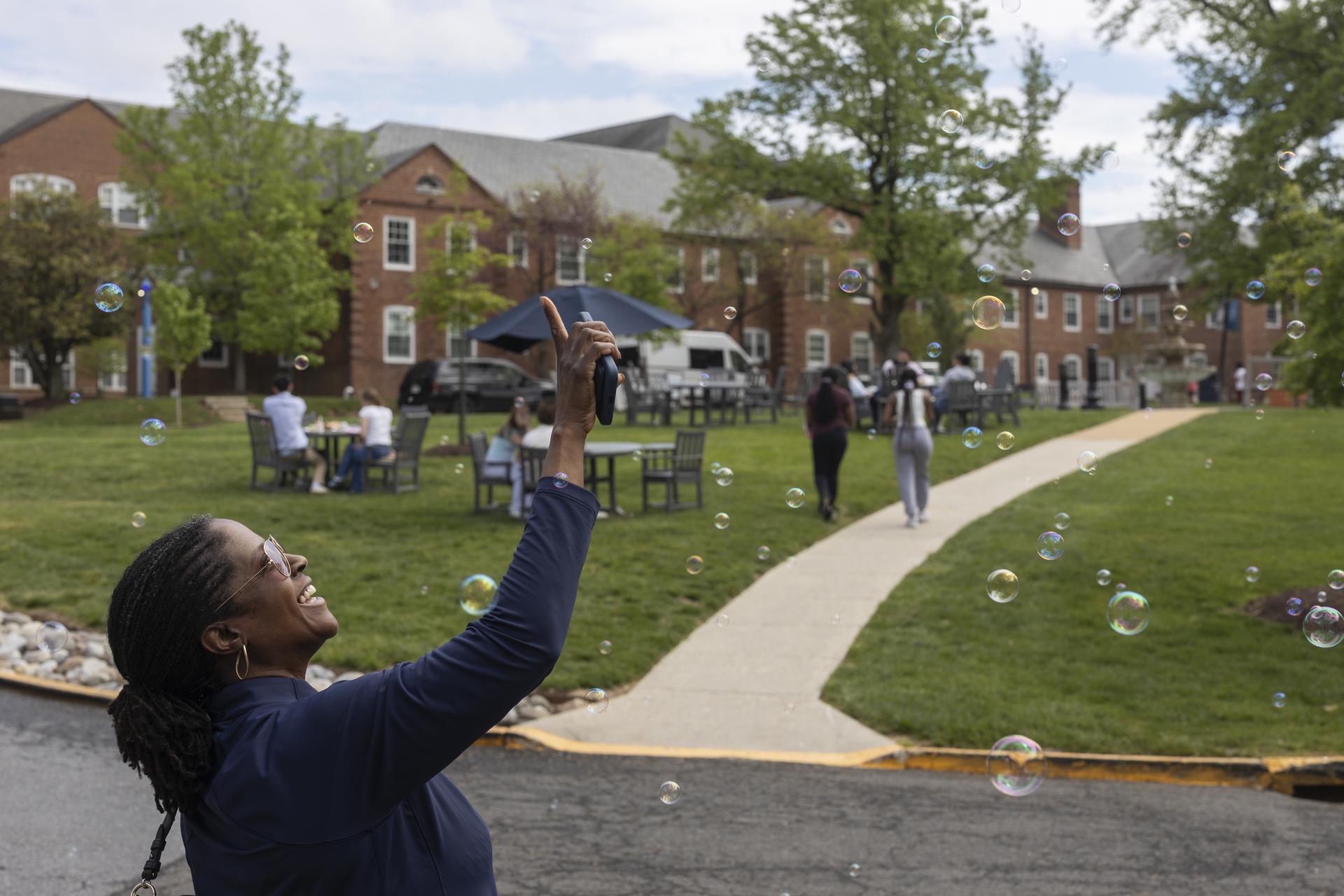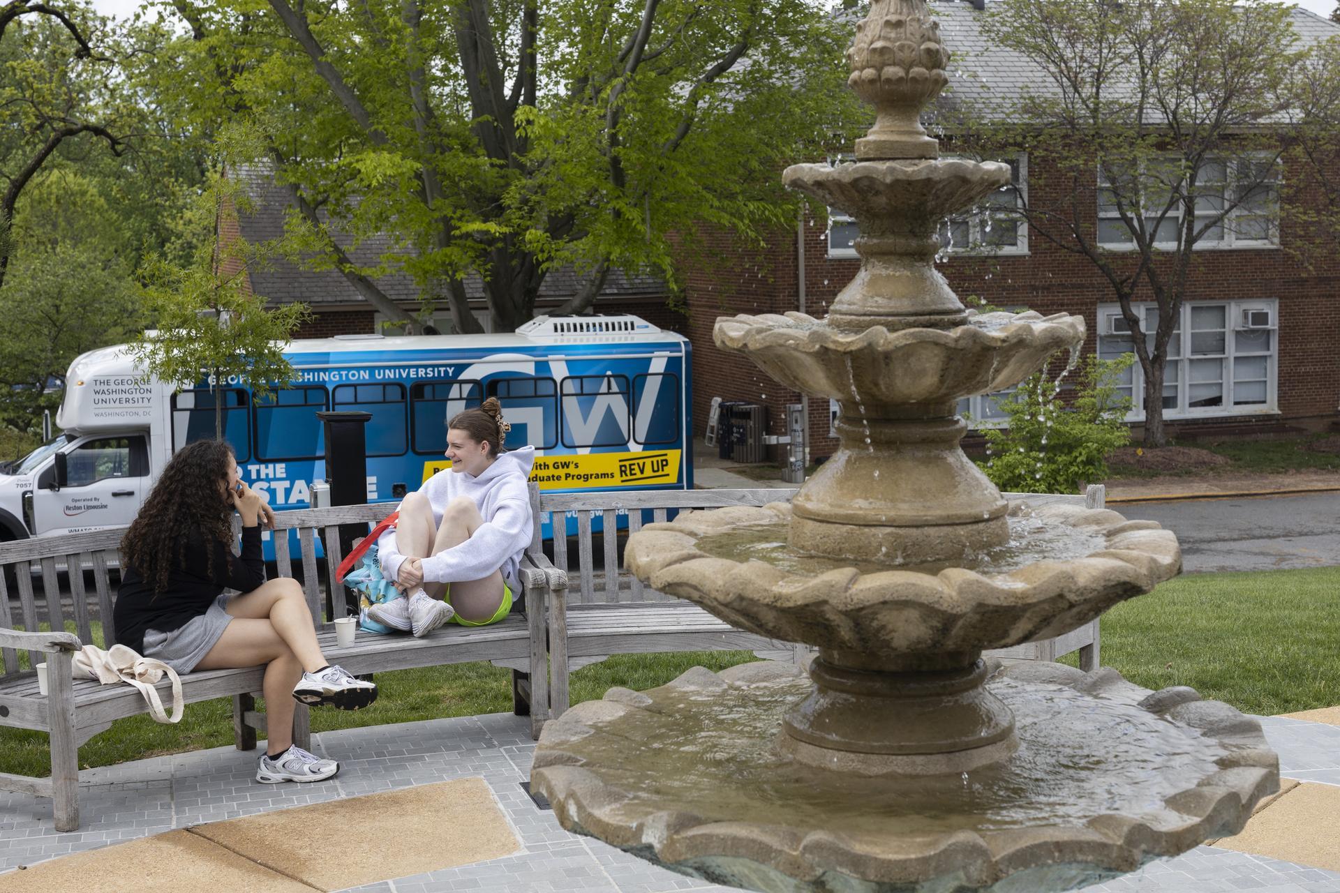 The George Washington University community came together on Saturday at the Mount Vernon campus for Fountain Day. At the annual spring celebration, the Vern's iconic fountain, which stands at the center of the campus' quad, is turned on for the first time of the year. Attendees enjoyed food, colorful treats from Happy Hippo shaved ice truck, yard games, a raffle and plenty of bubbles. The warm, sunny day provided a classic spring setting for the beloved GW tradition and brought plenty of students out of their residence halls for a break before finals.