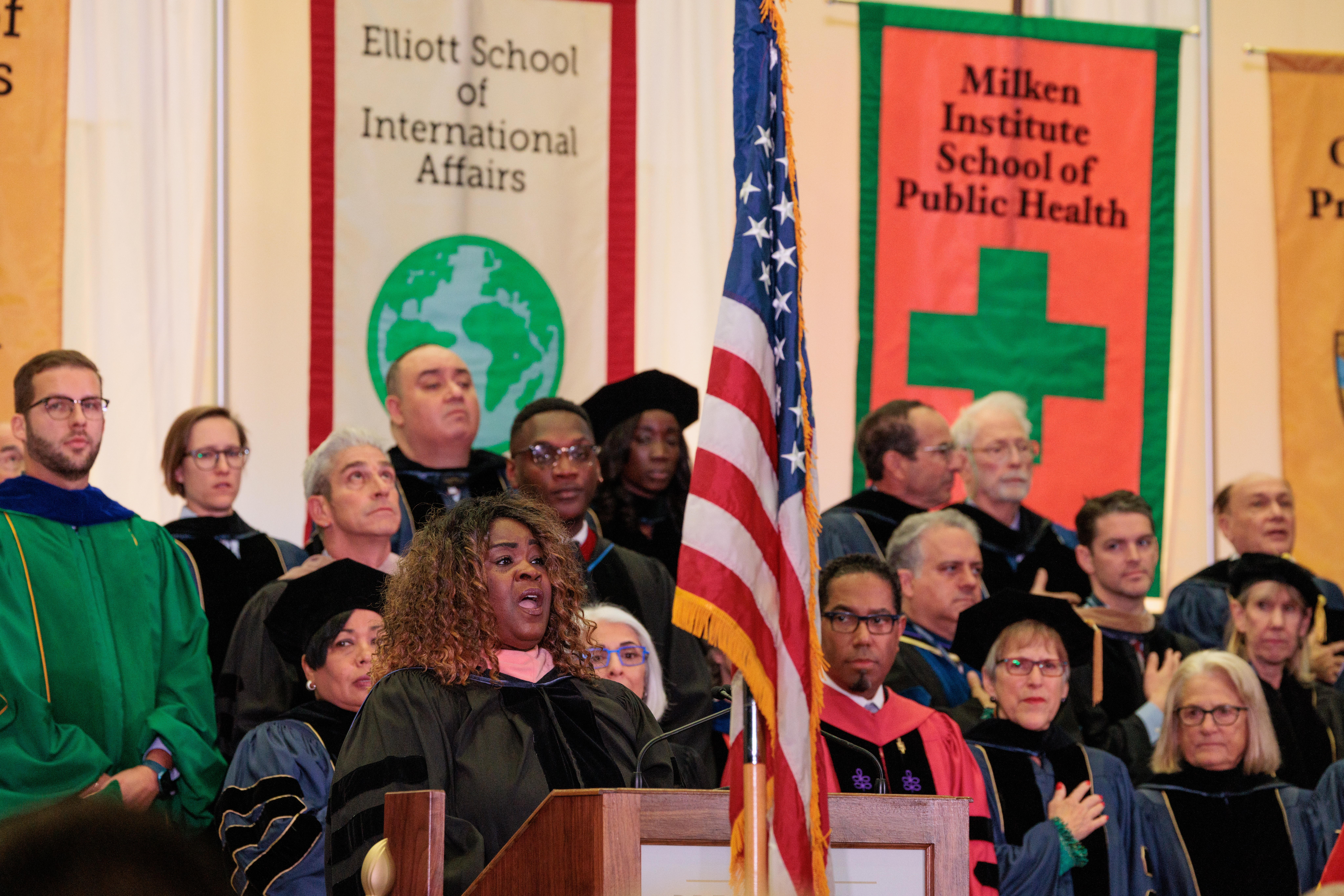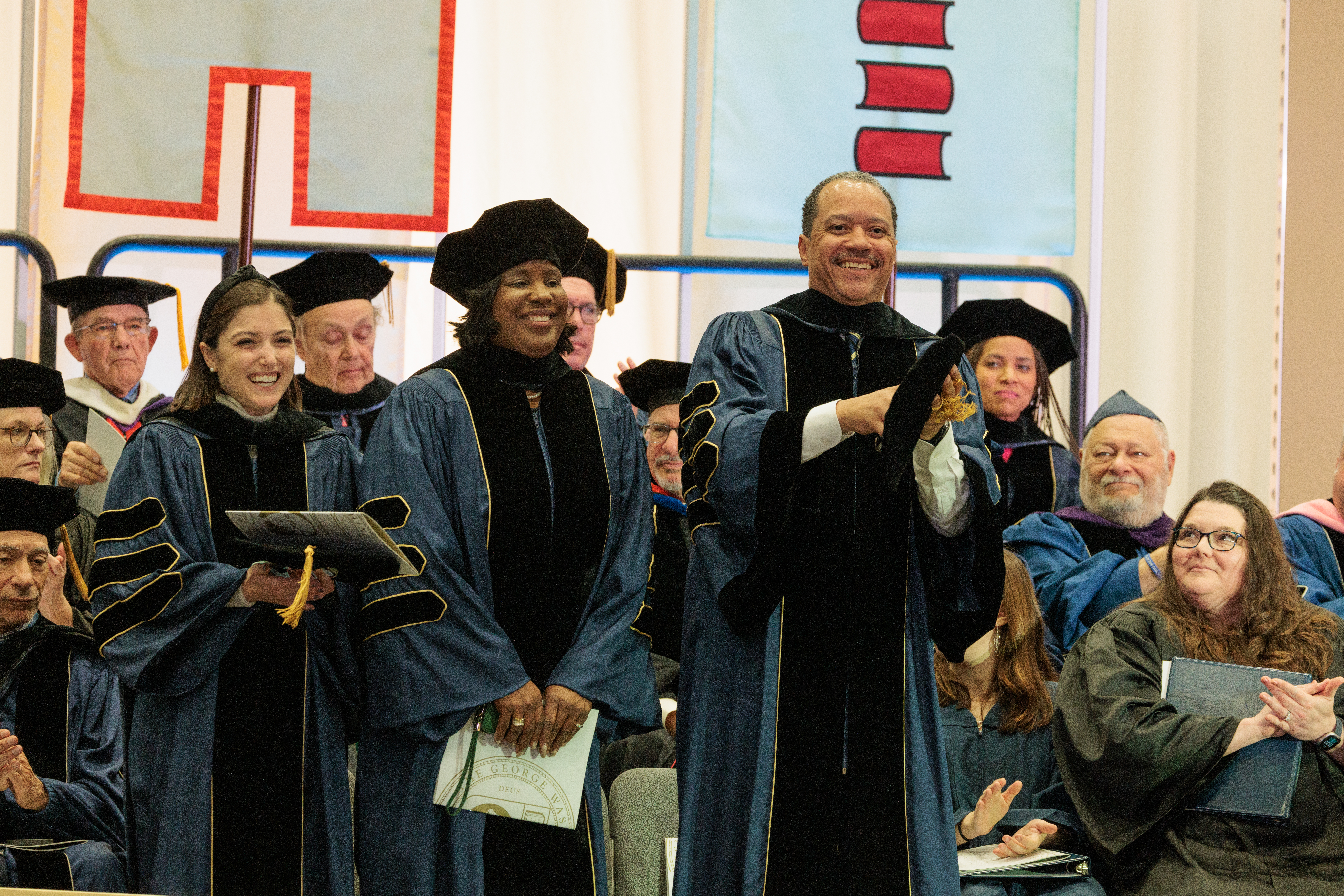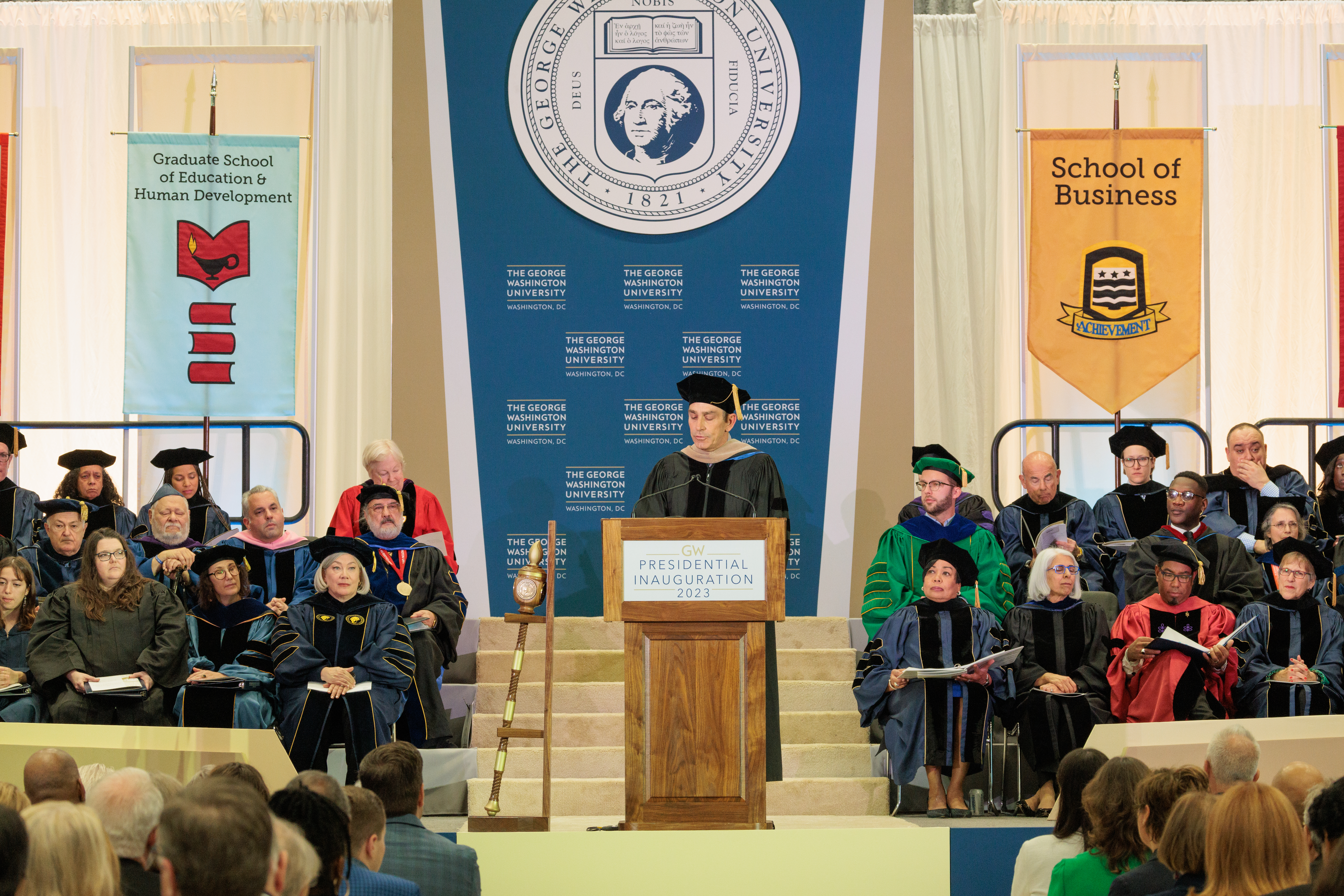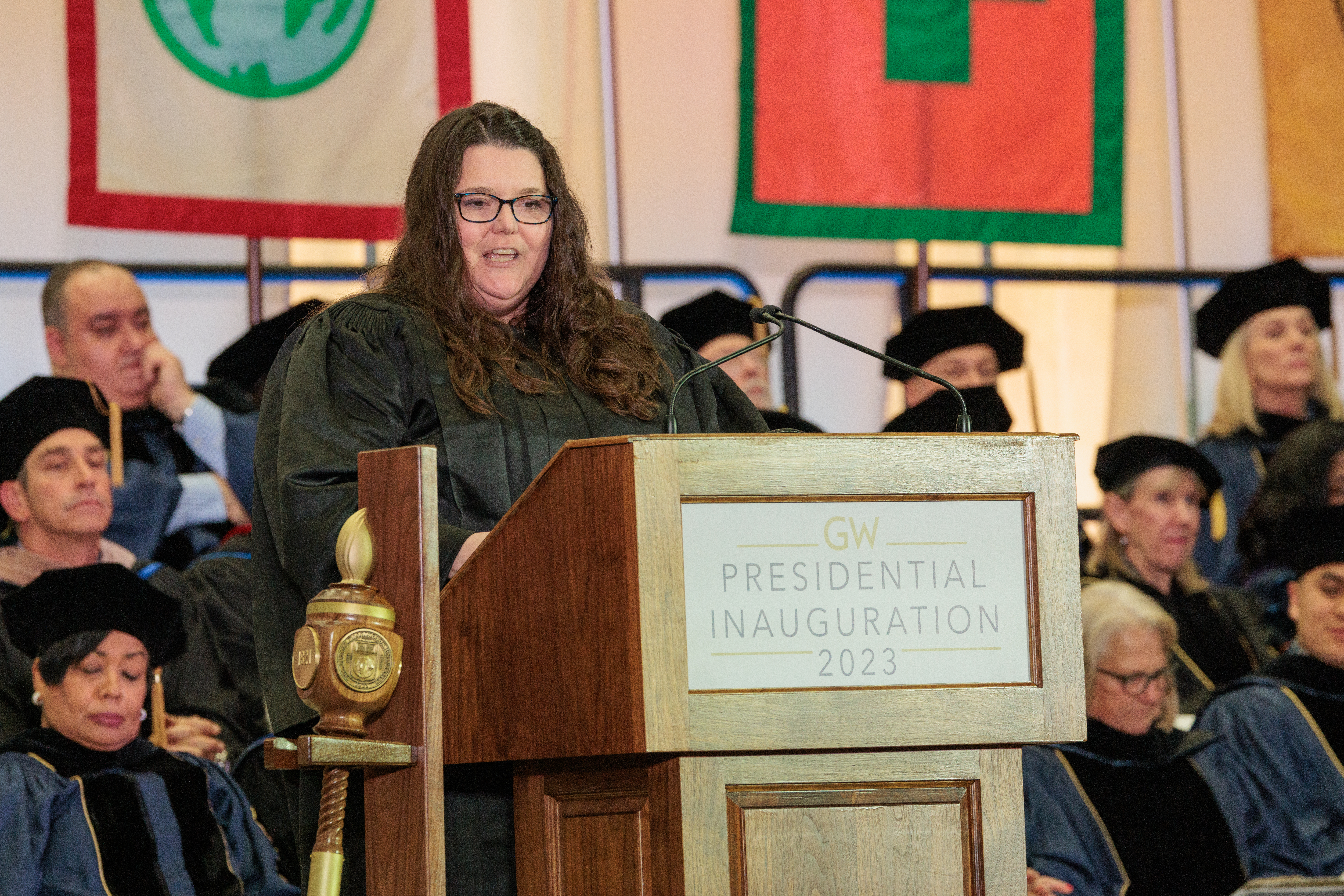 In addition to Granberg, speakers included Provost Christopher Alan Bracey, who delivered welcome remarks; Board of Trustees Chair Grace Speights, J.D. '82; Chair of the Faculty Senate Executive Committee Ilana Feldman; international affairs student and Student Association President Arielle Geismar; GW Staff Council President Bridget Schwartz; GW Alumni Association President Maxwell-Gocala-Nguyen, M.A. ’16; Professor and Director of the Graduate Program in Islamic Studies Mohammad H. Faghfoory; alumnus Gideon Zelermyer, B.A. ’97; and Multicultural Student Services Center Director Dustin J. Pickett.