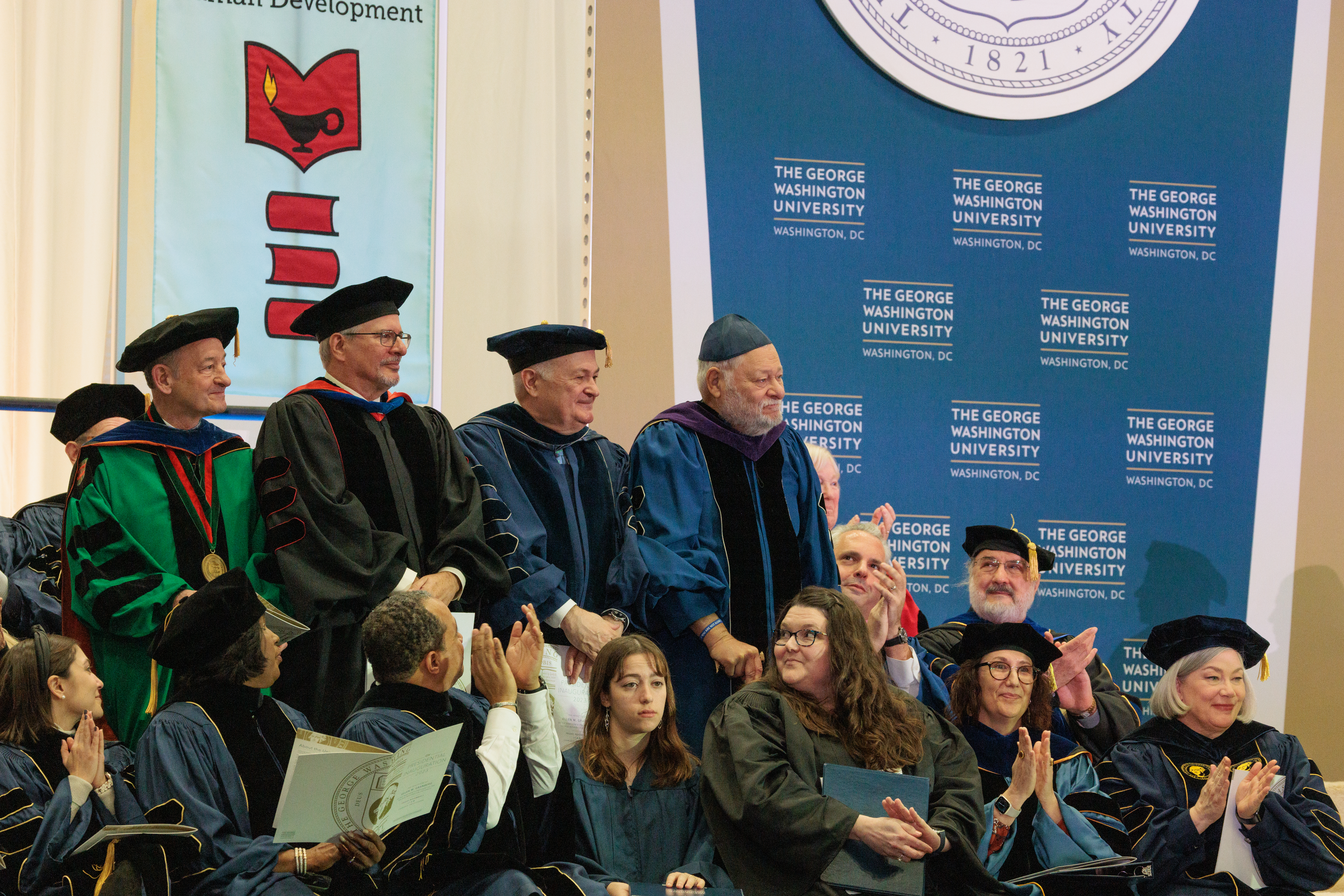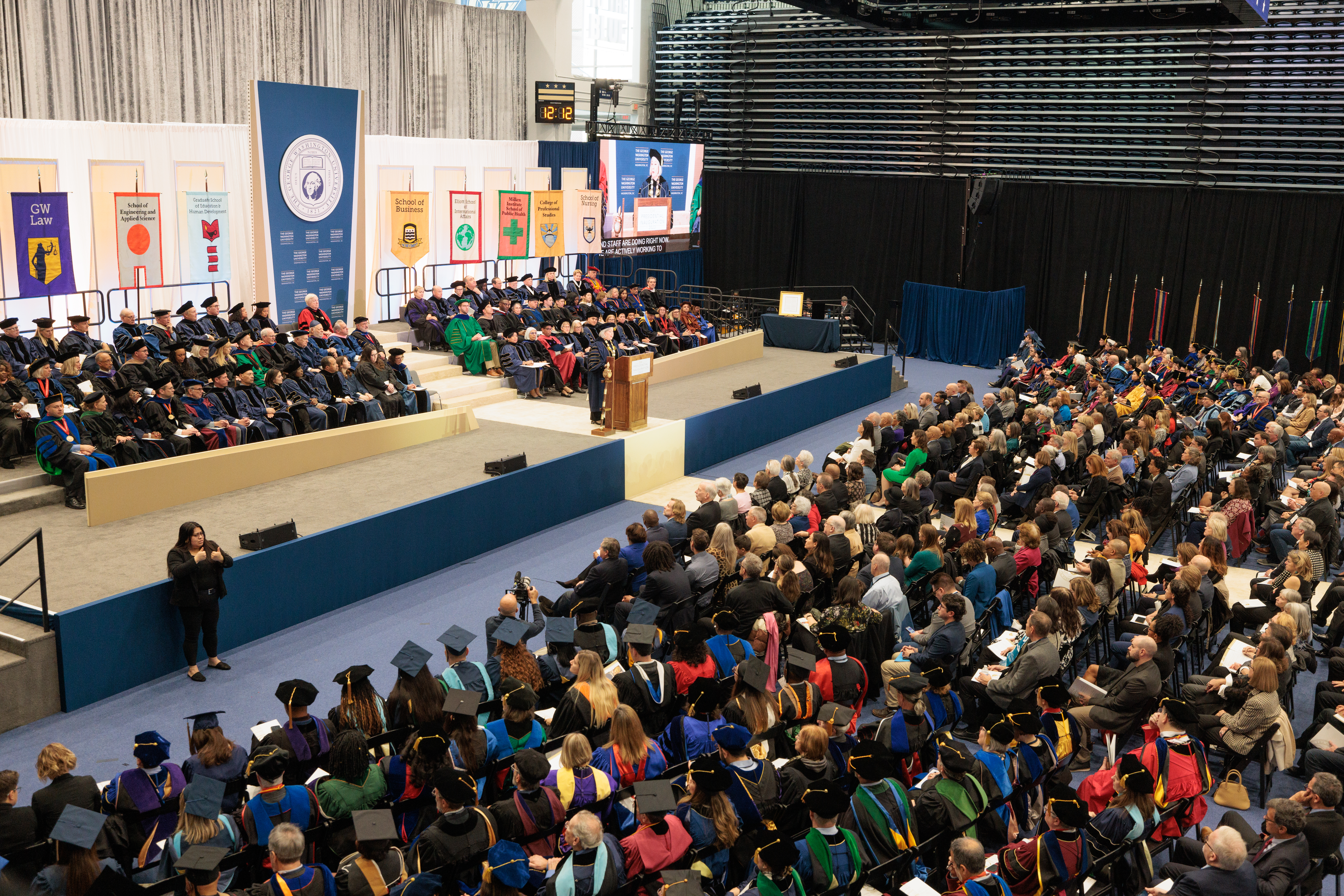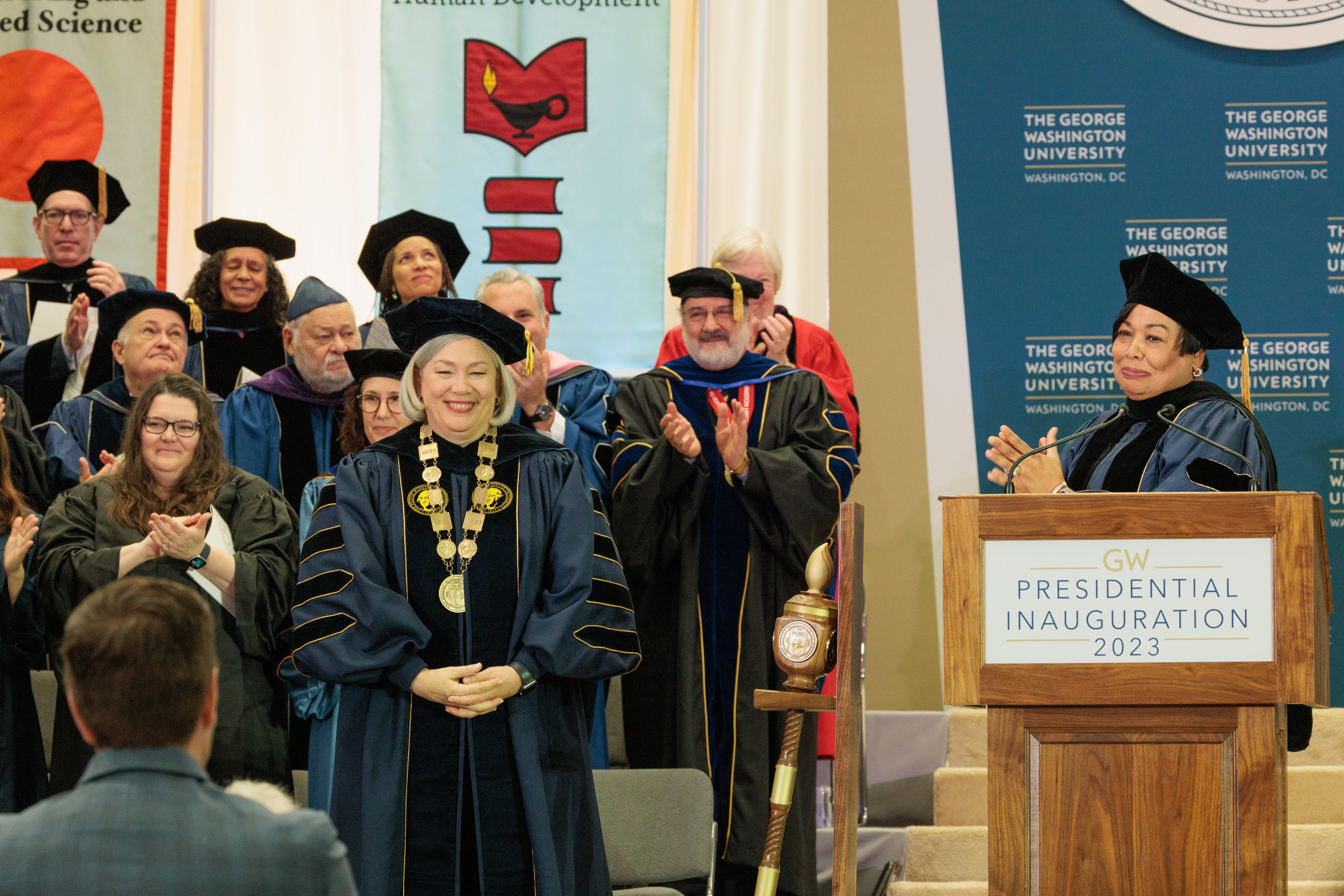 In addition to Granberg, speakers included Provost Christopher Alan Bracey, who delivered welcome remarks; Board of Trustees Chair Grace Speights, J.D. '82; Chair of the Faculty Senate Executive Committee Ilana Feldman; international affairs student and Student Association President Arielle Geismar; GW Staff Council President Bridget Schwartz; GW Alumni Association President Maxwell-Gocala-Nguyen, M.A. ’16; Professor and Director of the Graduate Program in Islamic Studies Mohammad H. Faghfoory; alumnus Gideon Zelermyer, B.A. ’97; and Multicultural Student Services Center Director Dustin J. Pickett.
