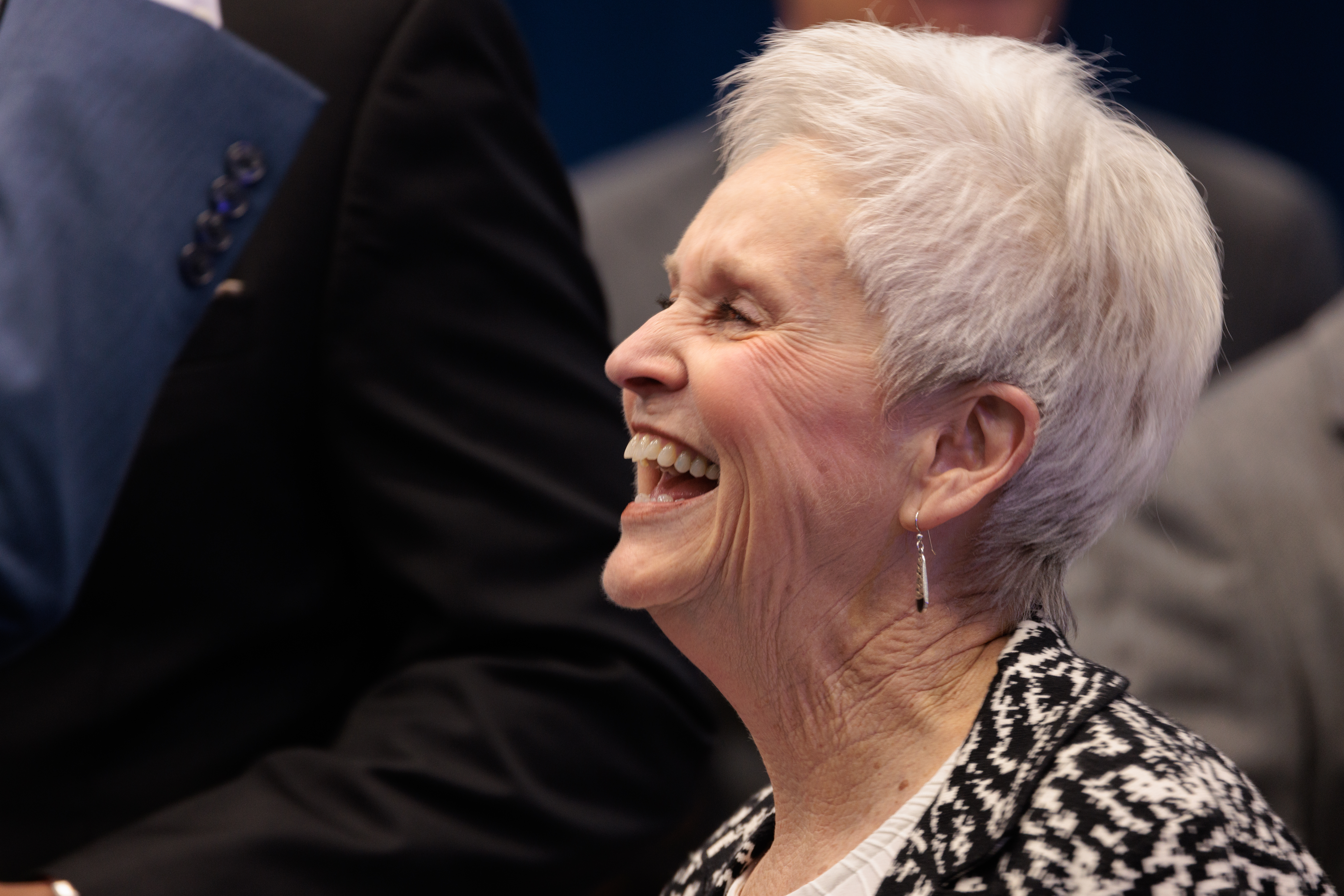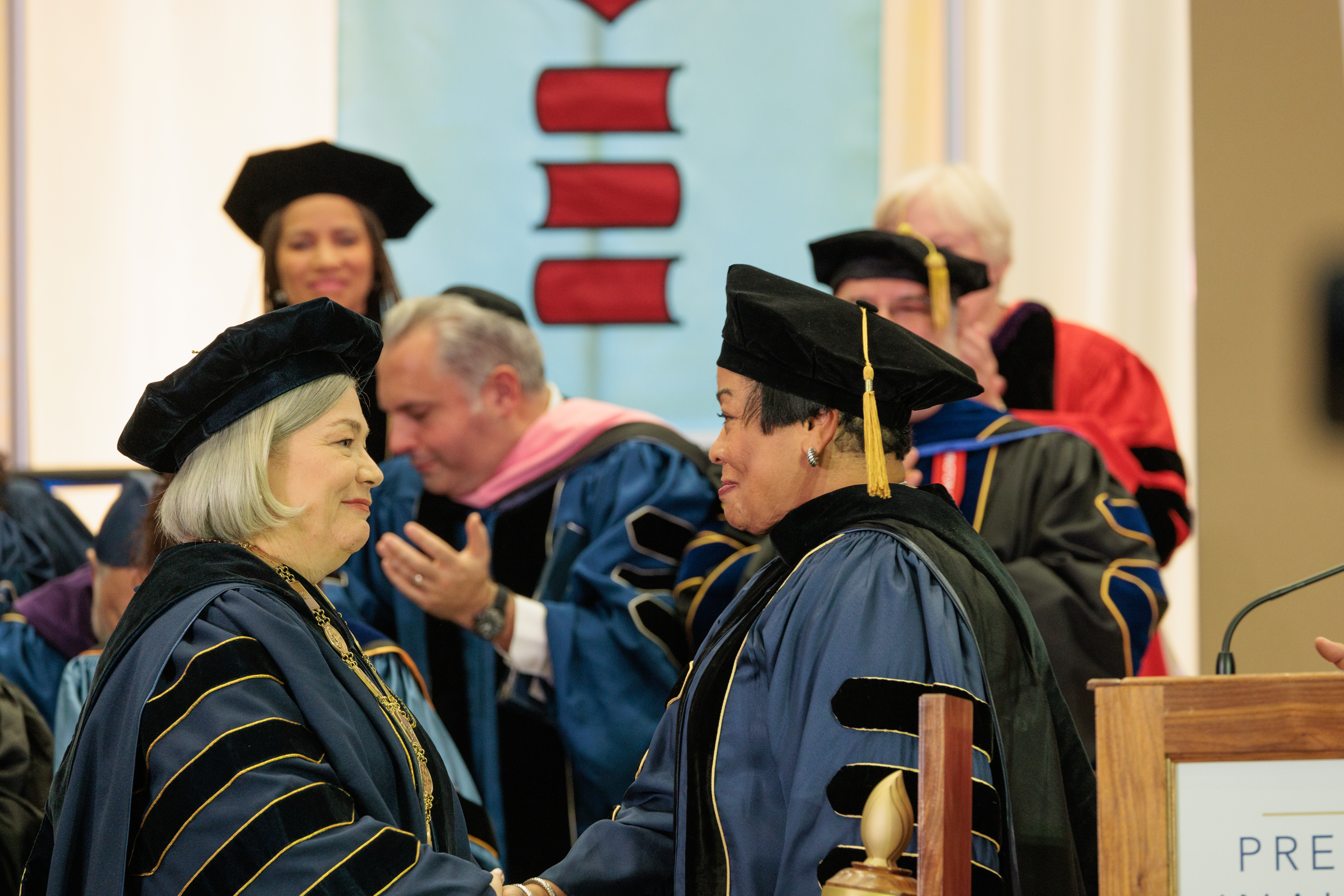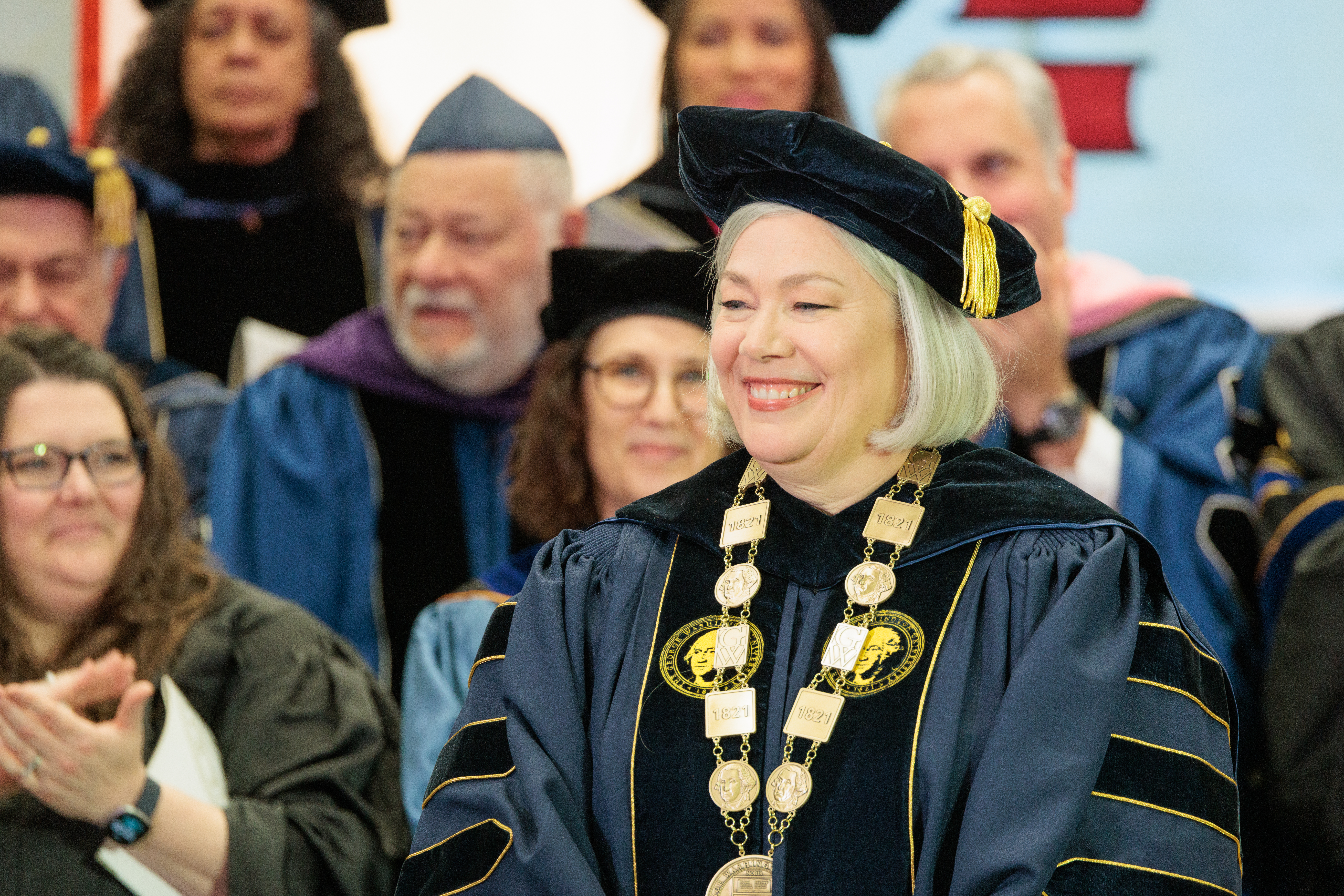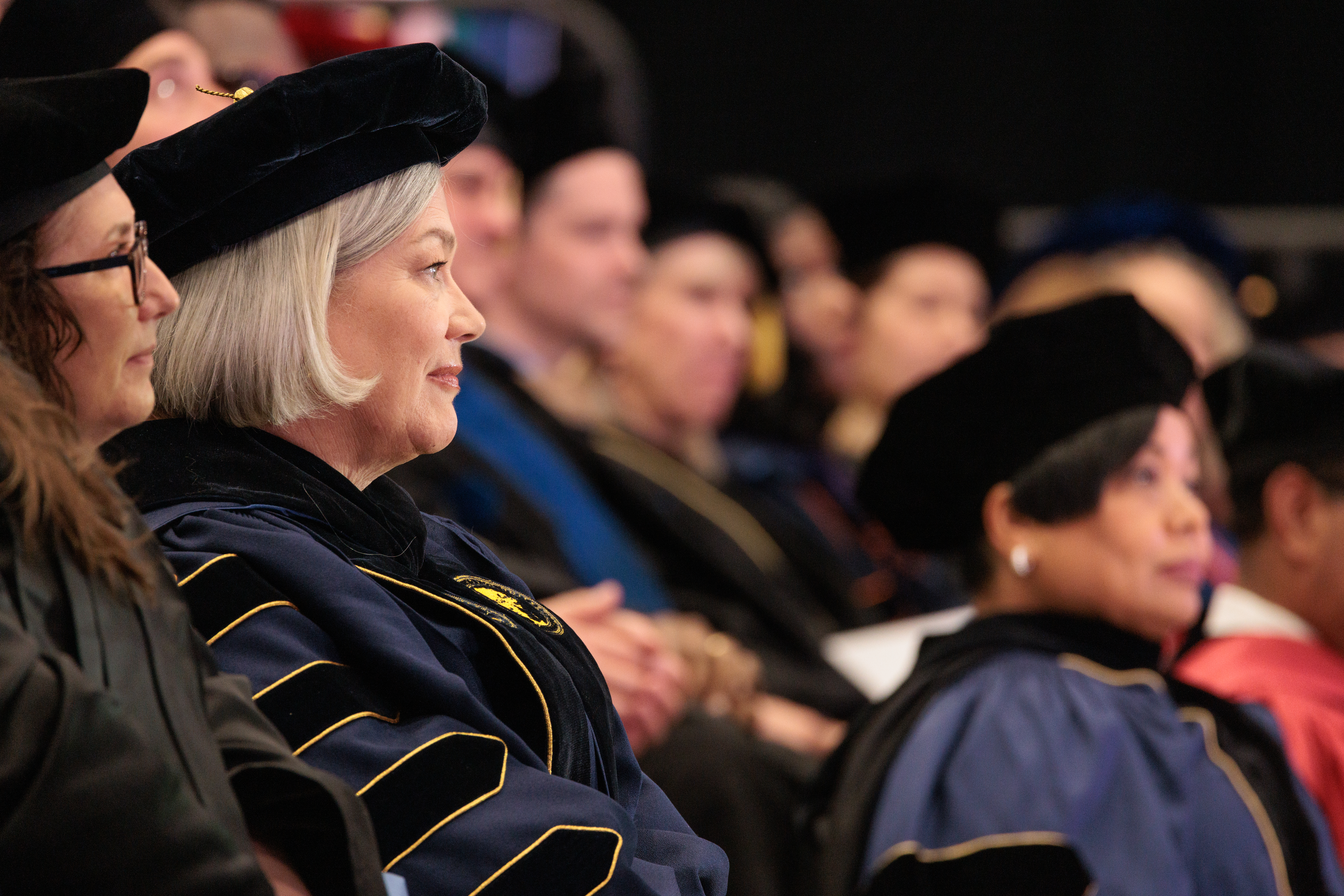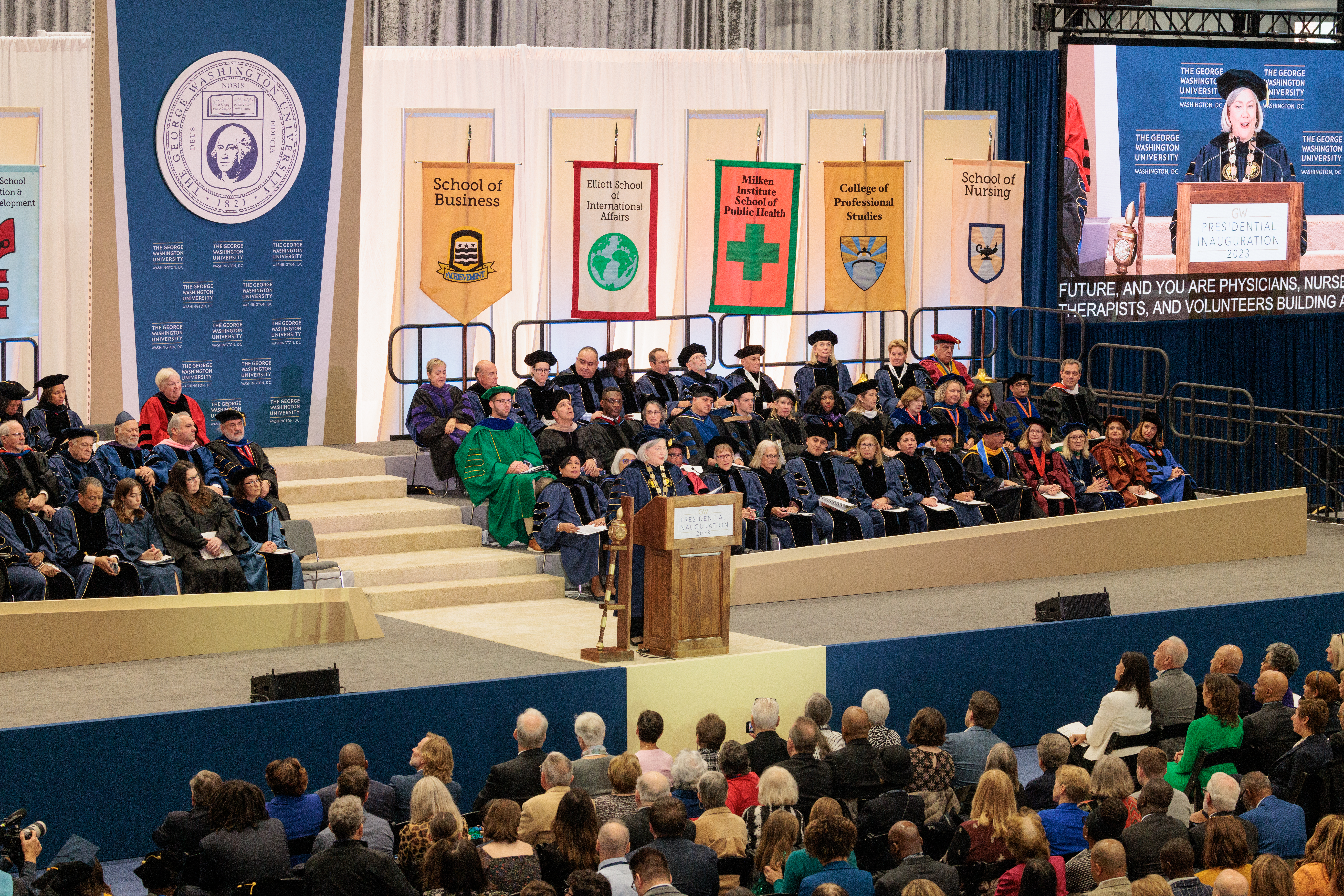 On Friday, leadership was formally conferred to George Washington University's 19th president, Ellen M. Granberg, at her investiture ceremony at the Charles E. Smith Center. The traditional ceremony conveyed institutional confidence in Granberg’s ability to lead the university in the early years of its third century. Surrounded by family, including her wife, Sonya Rankin, and friends, as well as a select number of current and previous university leaders, faculty, staff and alumni, Granberg delivered an inauguration address challenging the GW community to continue working toward shaping society and changing the world.
