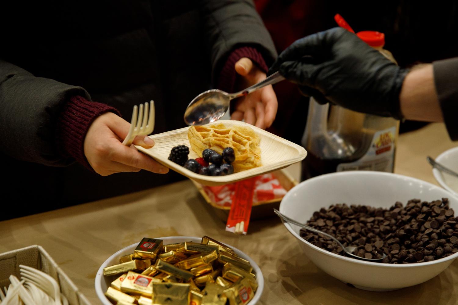 Students on Monday night got a brief reprieve from their final exam studies to partake in a George Washington University tradition—Midnight Breakfast. Students enjoyed waffles, cereal, fruit and other food served by Provost Forrest Maltzman and other faculty and staff volunteers. The food, video games, board games and some oversized "rides" lasted from 10:30 p.m. until 12:30 a.m.